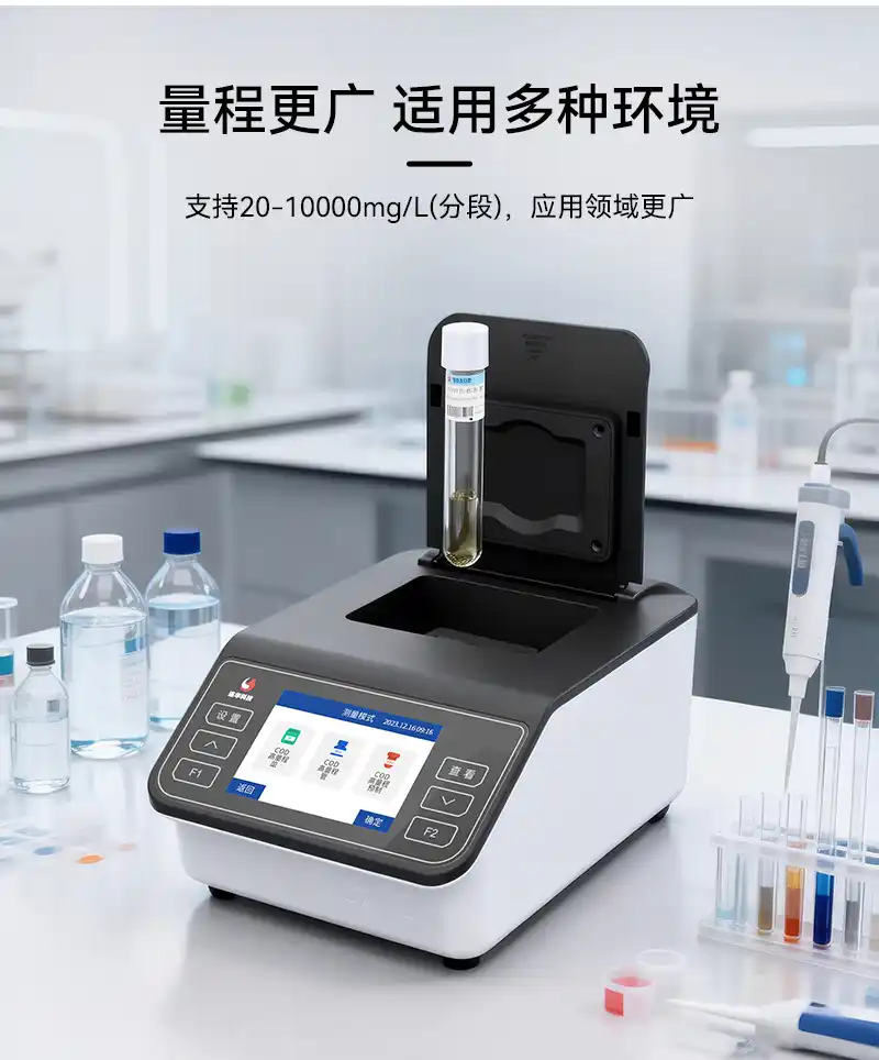 4、量程更广适用多种环境支持20-10000mg/L(分段)检测COD,应用领域更广
