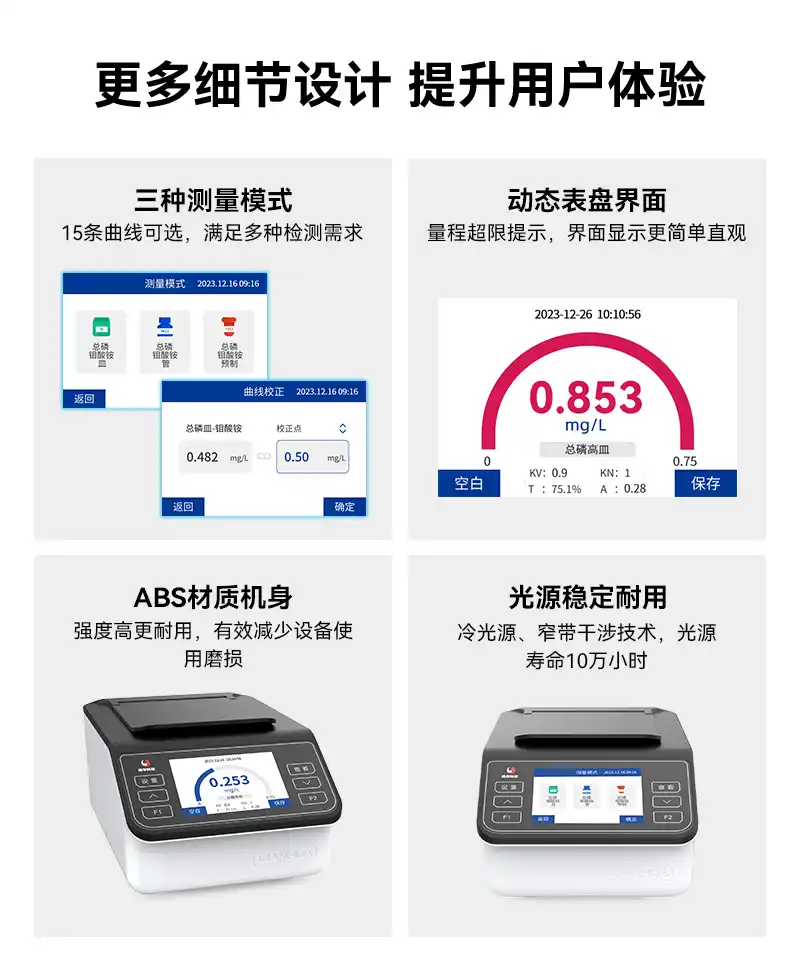 1、简单实用高效满足需求,总磷指标快速检测,功能简单浓度直读