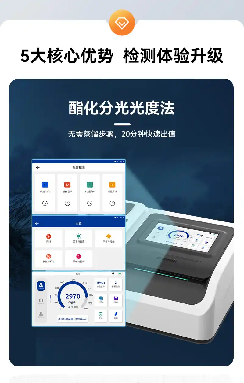 (1)采用酯化分光光度法,无需蒸馏步骤,20分钟快速出值;