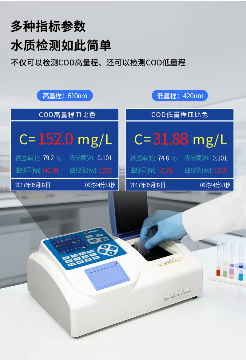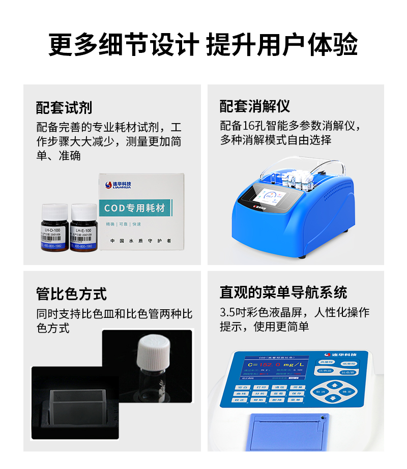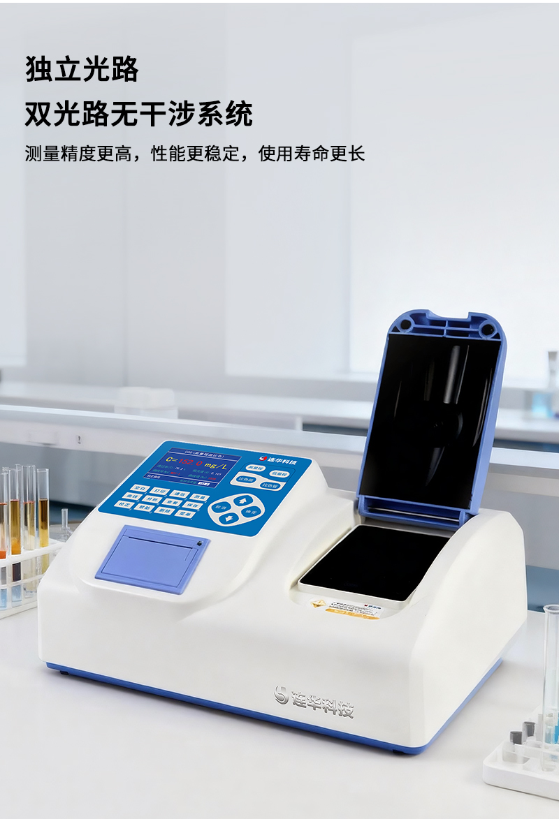简要描述: 仪器依据《水质化学需氧量的测定快速消解分光光度法(HJ/T399-2007)》标准设计,采用双光路无干涉系统,可以测定COD高量程、COD低量程水样,同时支持皿比色与管比色两种比色方式,便于用户选择合适的耗材进行实验,具有极高的便利性和性价比。
