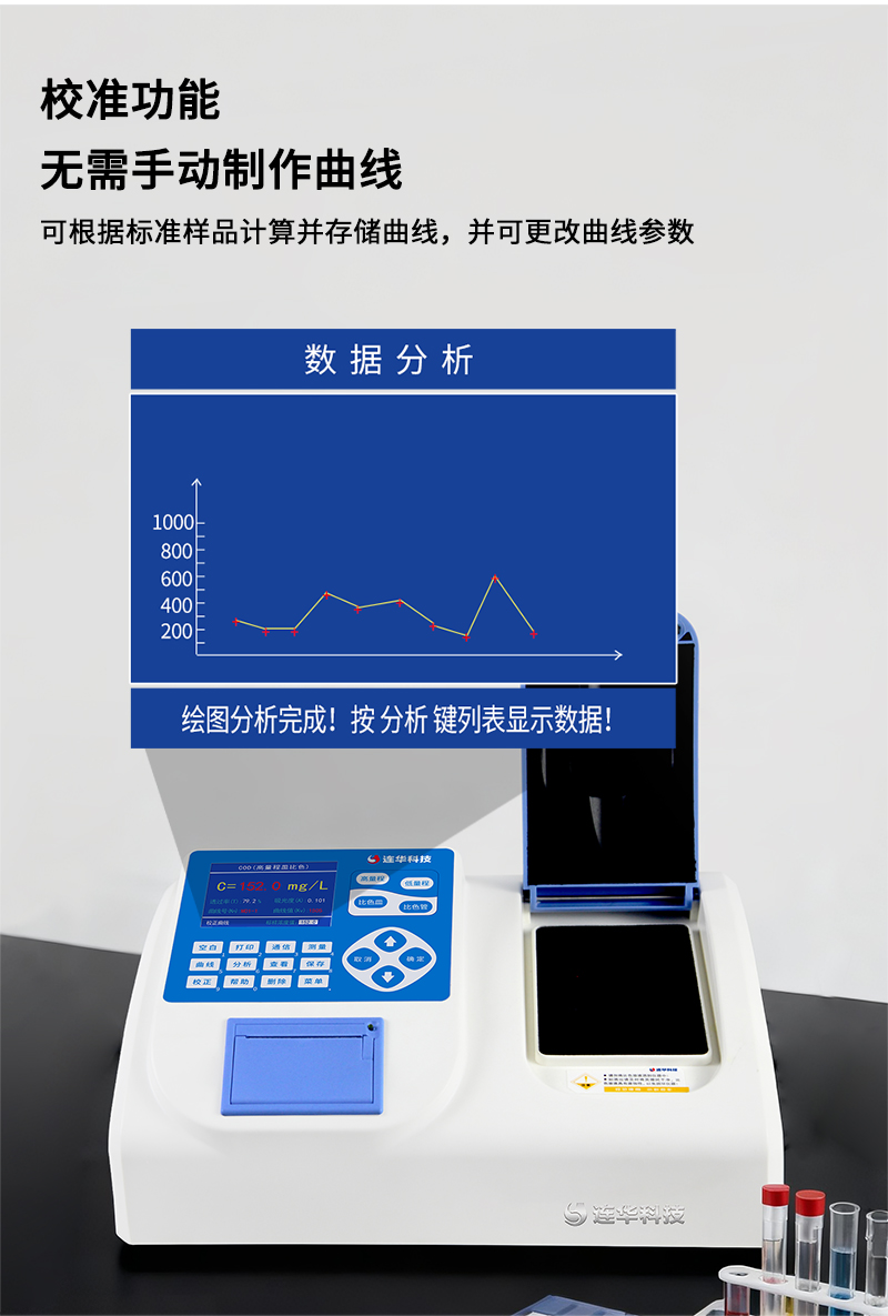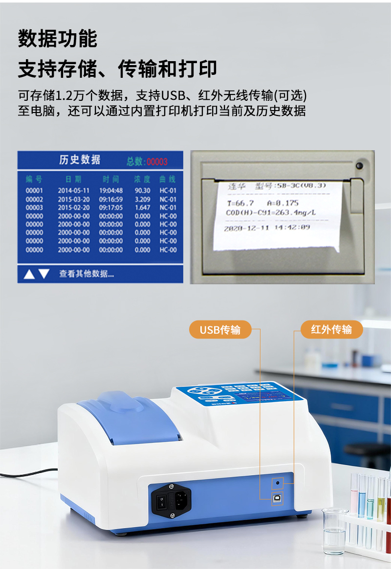 1、快速、准确测定地表水、中水、城市污水及工业废水中的(COD);2、测定COD高量程、COD低量程水样,还同时支持皿比色和管比色两种比色方式;3、独立双光路无干涉系统,浓度直读、精度高、寿命长、更稳定;4、直观的菜单导航系统以及3.5英寸的彩色液晶屏,人性化操作提示,使用更简单;5、仪器自备校准功能,可根据标准样品计算并存储曲线,无需手动制作曲线;6、大、小字体显示模式自由切换,显示数据更清晰,参数更详细;7、可向计算机传输当前数据和历史数据,支持USB、红外无线传输;8、同时支持比色皿和比色管两种比色方式;9、仪器内置打印机,可打印当前数据和所有存储的历史数据;10、配备完善的专业耗材试剂,工作步骤大大减少,测量更加简单、准确;11、采用自主设计的模具非金属机壳,整机美观大方;12、支持历史数据存储查看功能,可存储1.2万个数据;13、用户可根据需要,选配氨氮检测项目。