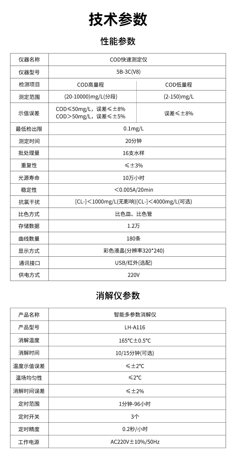 二、COD高量程1、测定范围:(20~10000)mg/L(分段)2、示值误差:COD≤50mg/L,误差≤±8%;COD>50mg/L,误差≤±5%3、最低检出限:0.1mg/L4、测定时间:20分钟5、批处理量:16支水样6、重复性:≤±3%7、光源寿命:10万小时8、稳定性:<0.005A/20min9、抗氯干扰:[CL-]<1000mg/L(无影响);[CL-]<4000mg/L(可选)10、比色方式:比色皿、比色管11、存储数据:1.2万12、曲线数量:180条13、显示方式:彩色液晶(分辨率320*240)14、通讯接口:USB/红外(选配)15、供电方式:220V