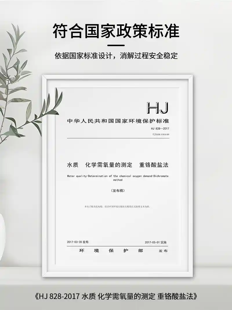12、符合标准:依据环境标准《HJ 828-2017 水质 化学需氧量的测定 重铬酸盐法 》的原理设计制造,同时兼顾原国标;