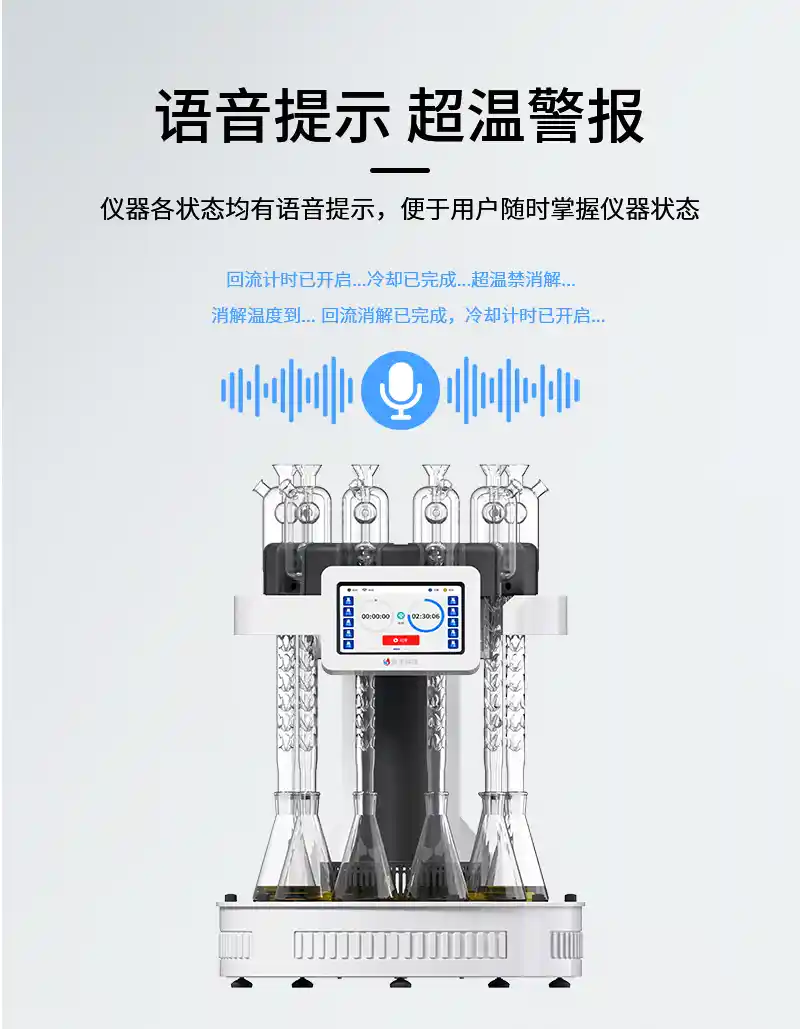 7、语音播报:可开启/关闭语音提示功能,消解温度到、冷却时间到、实验结束、超温等状态均有语音提示,便于用户随时掌握仪器状态;