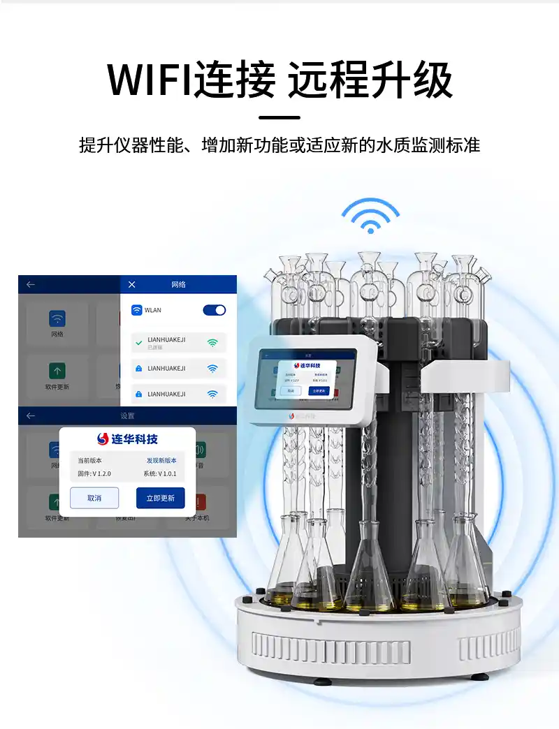 8、在线升级:支持WIFI网络连接,实现远程接收软件更新,以提升仪器性能、增加新功能或适应新的水质监测标准;