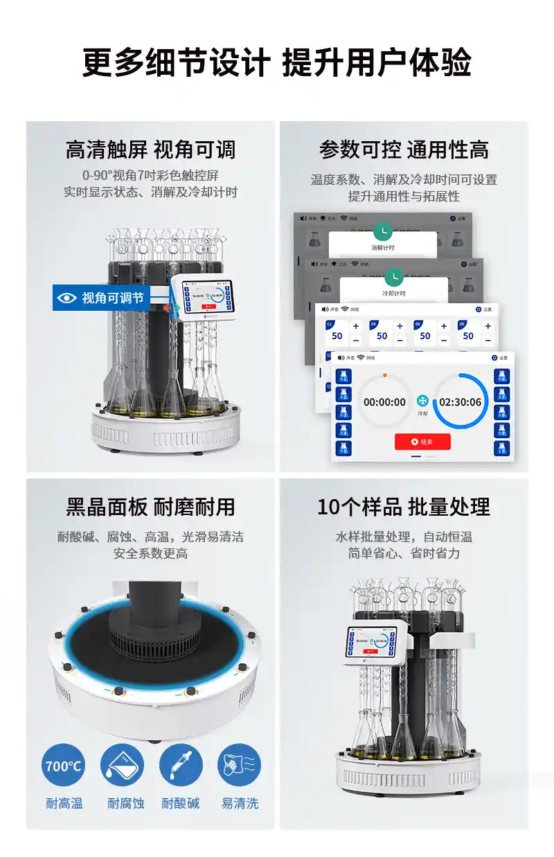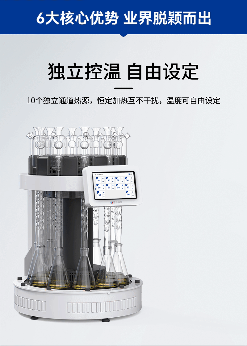 1、独立控温:10个独立通道热源,各通道恒定加热,互不干扰,每个加热单元可根据水样特性自由设置消解温度,保障样品达到标准要求的微沸状态;