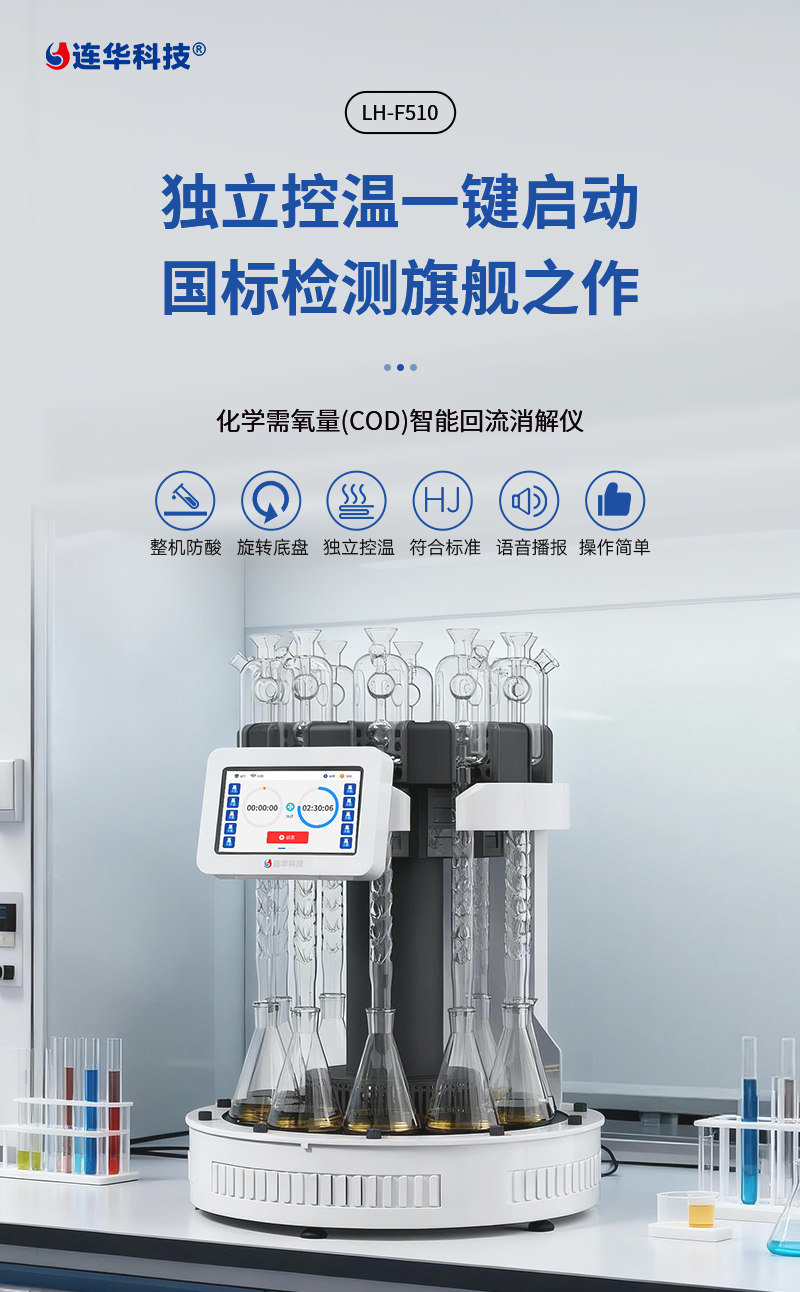简要描述: LH-F510型化学需氧量(COD)智能回流消解仪按照国家新标准《HJ 828-2017 水质 化学需氧量的测定 重铬酸盐法》原理设计制造,同时该仪器兼顾原国标。仪器采用独特的黑晶加热组件及保温措施,每个加热单元均可独立加热,加热效率更高、控温能力更强,节能的同时使仪器的安全性能大大提高。