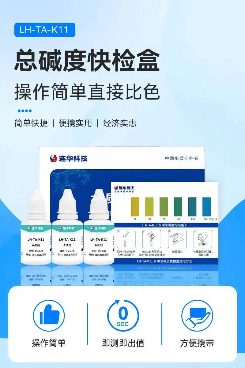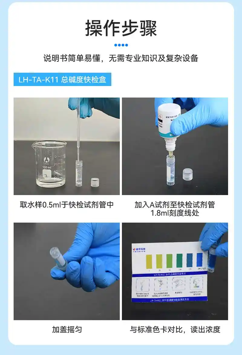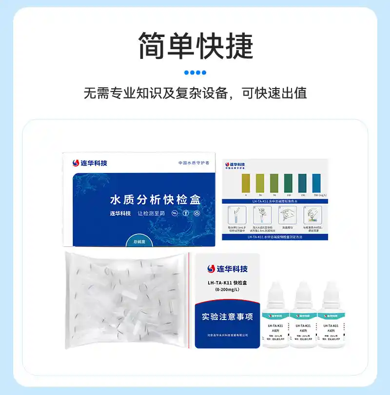 简要描述: 总碱度指标(0-200mg/L)快速检测,操作简单,反应灵敏,轻便易携,经济实惠。