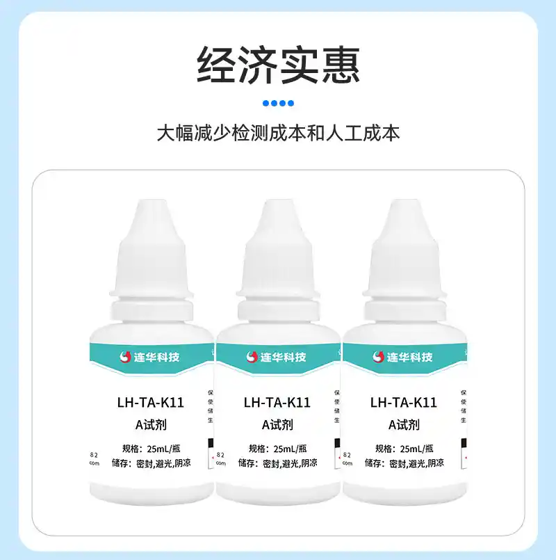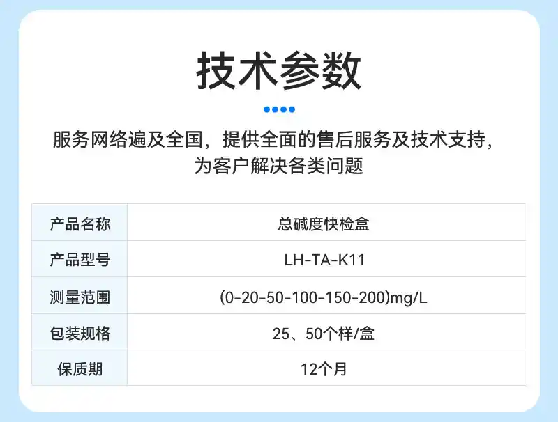 试剂名称:总碱度快检盒试剂型号:LH-TA-K11包装规格:25、50个样/盒量 程:0-20-50-100-150-200mg/L保质期:12个月