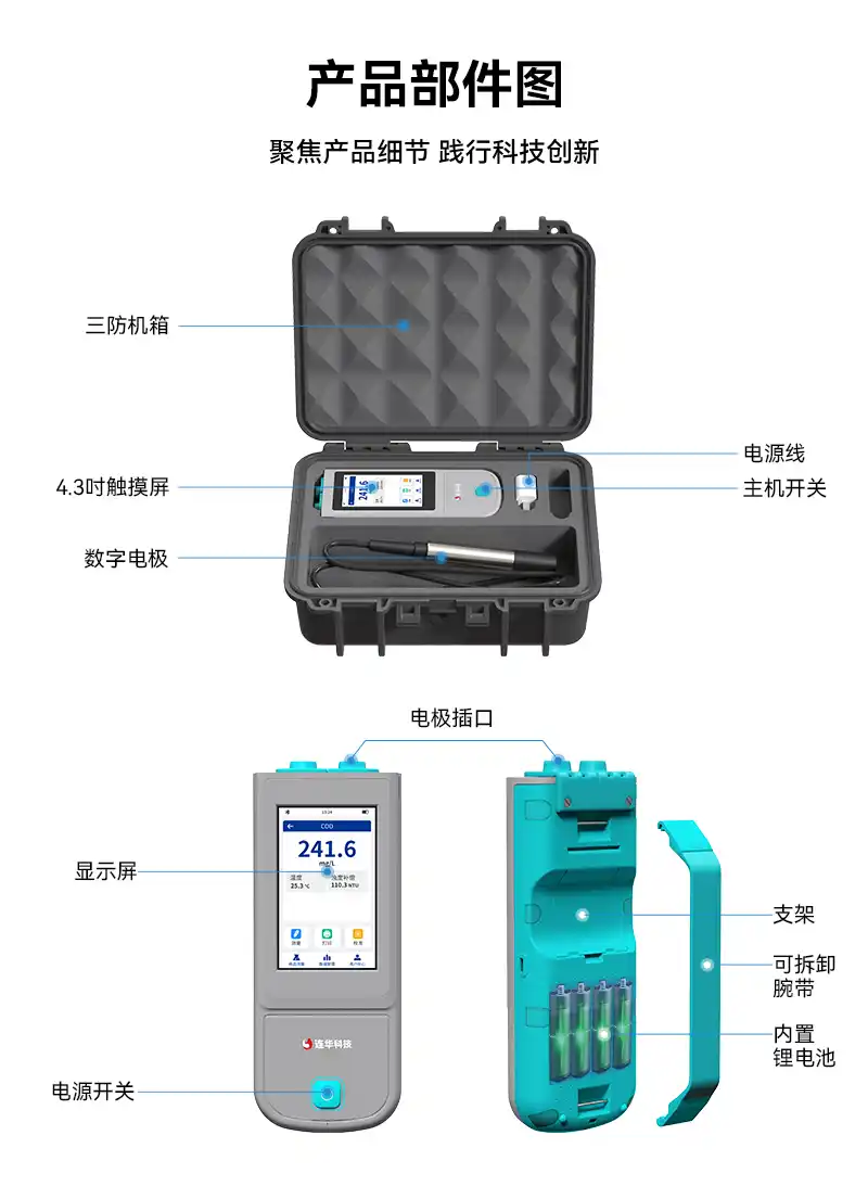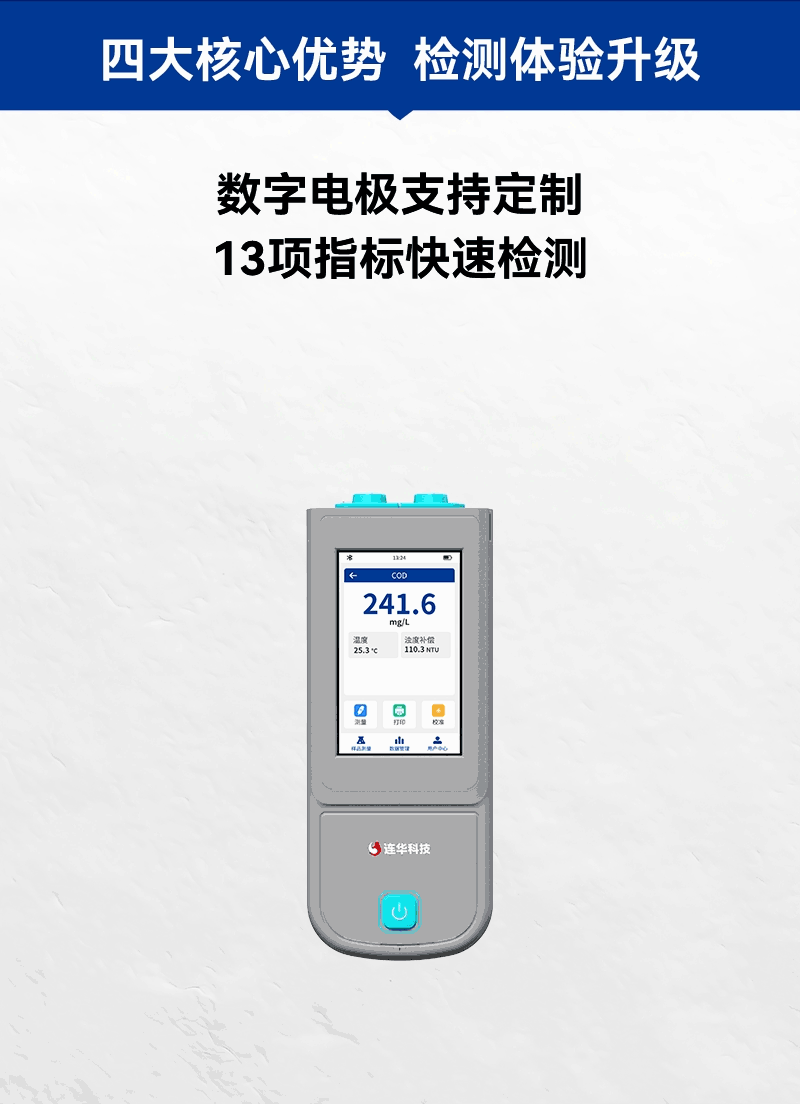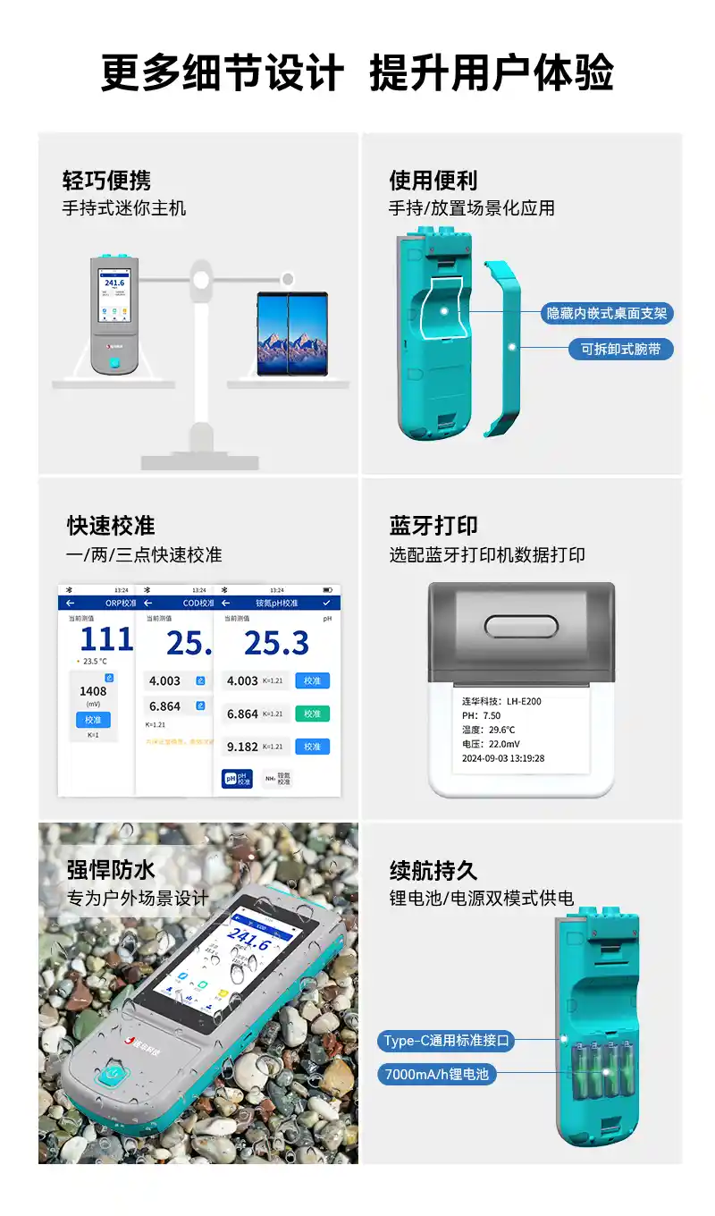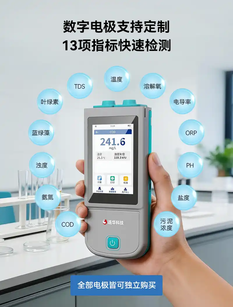 1、手持式迷你主机,支持COD、氨氮、浊度、蓝绿藻、叶绿素、电导率、PH、ORP、溶解氧、污泥浓度、温度13项指标快速检测,满足各领域水质检测需求;