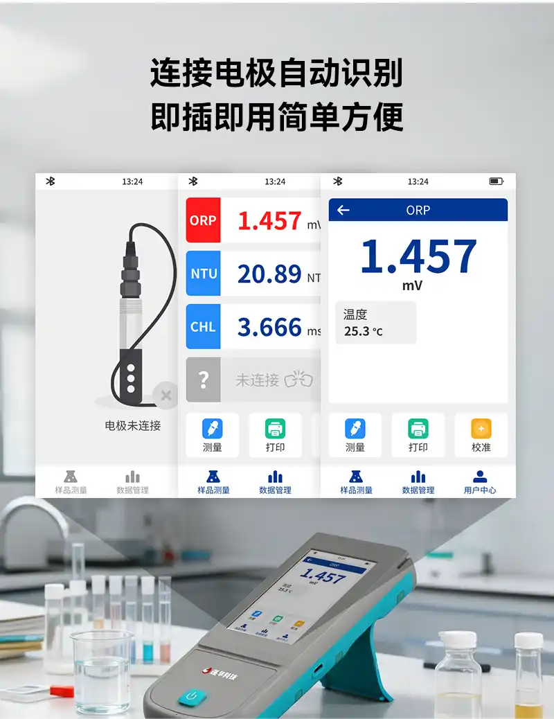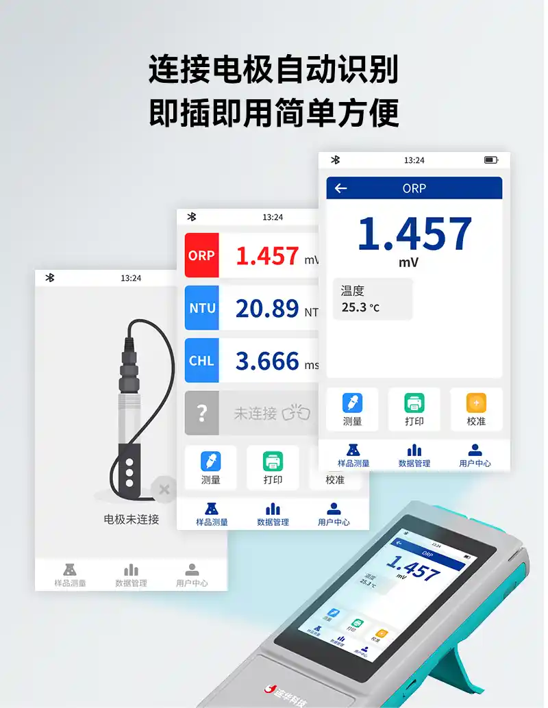 3、采用全数字电极,连接电极自动智能识别,支持自动温度补偿,有效避免环境温度影响,提高测值精准度和稳定性;