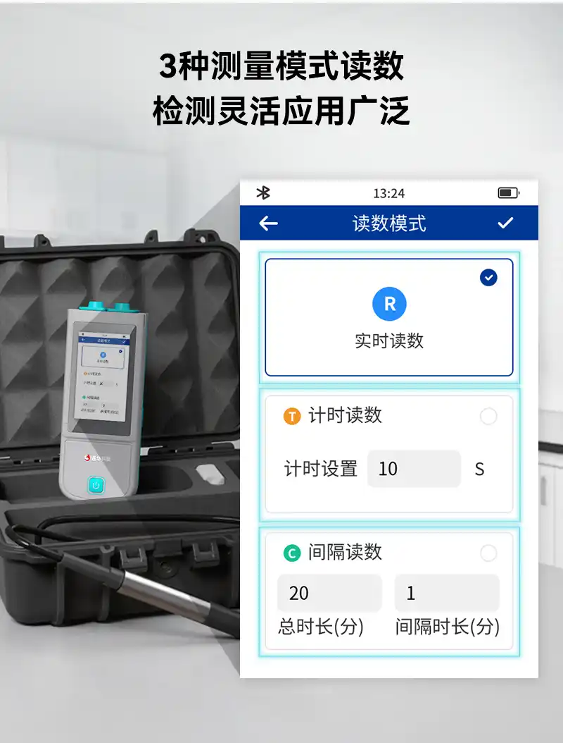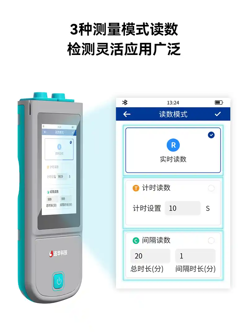 2、内置实时读数、计时读数、间隔读数3种测量模式读数,可根据检测场景及需求灵活选择;