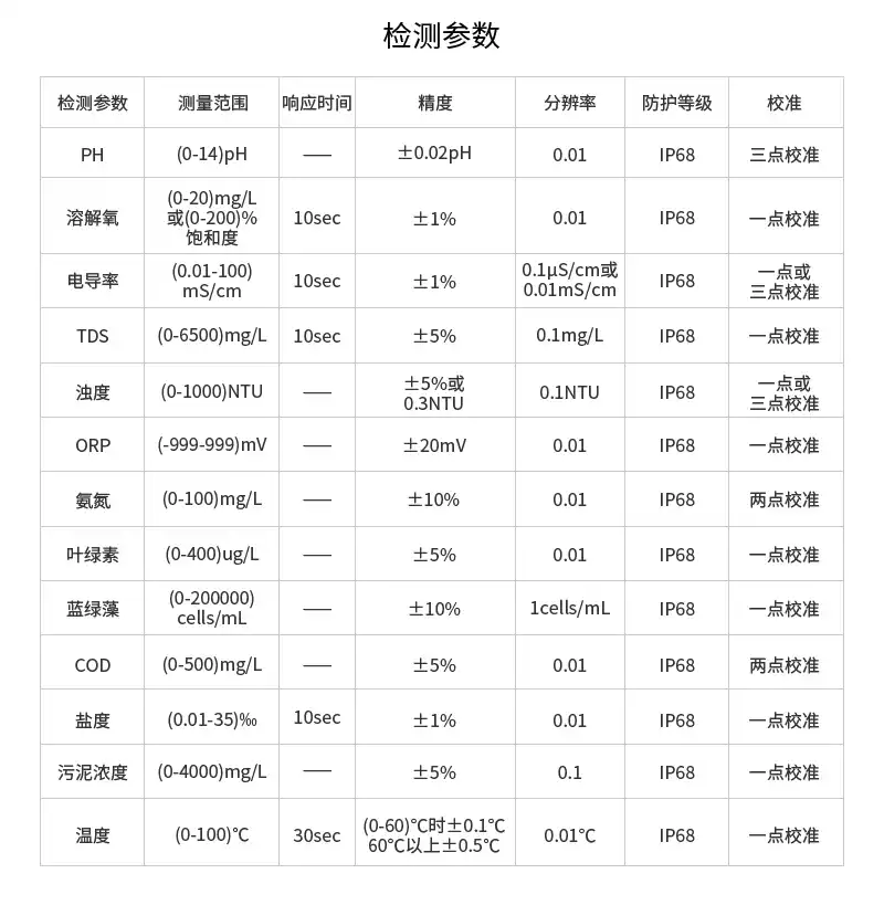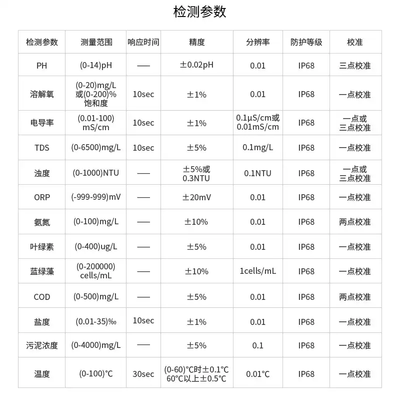 1.PH1.1测量范围:(0~14)pH1.2响应时间:<1秒1.3测量精度:±0.02pH1.4分辨率:0.01pH1.5防护等级:IP681.6校准方式:3点校准2.溶解氧(DO)2.1测量范围:(0~20)mg/L或(0~200)%饱和度2.2响应时间:10秒2.3测量精度:±1%2.4分辨率:0.01mg/L2.5防护等级:IP682.6校准方式:1点校准3.电导率3.1测量范围:(0.01~100)mS/cm3.2响应时间:10秒3.3测量精度:±1%3.4分辨率:0.1μS/cm或0.01mS/cm3.5防护等级:IP683.6校准方式:1点或3点校准4.溶解性固体(TDS)4.1测量范围:(0-6500)mg/L4.2响应时间:10秒4.3测量精度:±5%4.4分辨率:0.1mg/L4.5防护等级:IP684.6校准方式:1点校准5.盐度5.1测量范围:(0.01-35)‰5.2响应时间:10秒5.3测量精度:±1%5.4分辨率:0.1mg/L5.5防护等级:IP685.6校准方式:1点校准6.浊度6.1测量范围:(0-1000)NTU6.2响应时间:<1秒6.3测量精度:±5%或0.3NTU6.4分辨率:0.1mg/L6.5防护等级:IP686.6校准方式:1点或3点校准7.氧化还原电位(ORP)7.1测量范围:(-999~999)mV7.2响应时间:<1秒7.3测量精度:±20mV7.4分辨率:0.01mV7.5防护等级:IP687.6校准方式:1点校准8.化学需氧量(COD)8.1测量范围:(0-500)mg/L8.2响应时间:<1秒8.3测量精度:±5%8.4分辨率:0.01mg/L8.5防护等级:IP688.6校准方式:2点校准9.氨氮9.1测量范围:(0-100)mg/L9.2响应时间:<1秒9.3测量精度:±10%测量值或±0.5mg/L,取较大值9.4分辨率:0.01mg/L9.5防护等级:IP689.6校准方式:2点校准10.叶绿素10.1测量范围:(0-400)ug/L10.2响应时间:<1秒10.3测量精度:±5%或0.5ug/L,取较大值10.4分辨率:0.01ug/L10.5防护等级:IP6810.6校准方式:1点校准11.蓝绿藻11.1测量范围:(0-200000)cells/mL11.2响应时间:<1秒11.3测量精度:±10%11.4分辨率:1cells/mL11.5防护等级:IP6811.6校准方式:1点校准12.污泥浓度12.1测量范围:(0-4000)mg/L12.2响应时间:<1秒12.3测量精度:±5%12.4分辨率:0.1mg/L12.5防护等级:IP6812.6校准方式:1点校准
