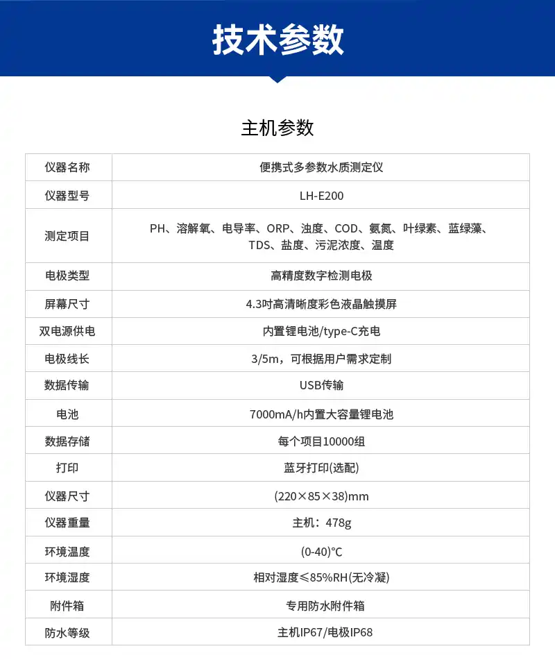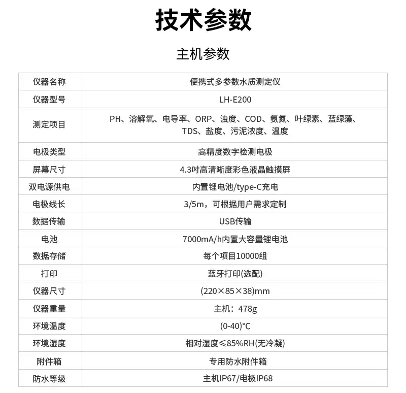 13.温度13.1测量范围:(0-100)℃13.2响应时间:30秒13.3测量精度:(0-60)℃时±0.1℃;60℃以上±0.5℃13.4分辨率:0.01℃13.5防护等级:IP6813.6校准方式:1点校准仪器参数1.仪器名称:便携式水质多参数测定仪2.仪器型号:LH-E2003.测定项目:PH、溶解氧、电导率、TDS、盐度、ORP、浊度、COD、氨氮、叶绿素、蓝绿藻、污泥浓度、温度4.电极类型:高精度数字检测电极5.屏幕尺寸:4.3吋高清晰度彩色液晶触摸屏6.电源供电:内置锂电池和type-C充电7.电极线长:3/5m,可根据用户需求定制8.数据传输:USB传输9.电池容量:内置大容量锂电池,7000mA/h10.数据存储:每个项目10000条,共10万+条11.打印方式:可选配蓝牙打印机12.仪器尺寸:(220*85*38)mm13.仪器重量:主机478g14.环境温度:(0~40)℃15.环境湿度:相对湿度≤85%RH(无冷凝)16.附件箱:专用防水附件箱