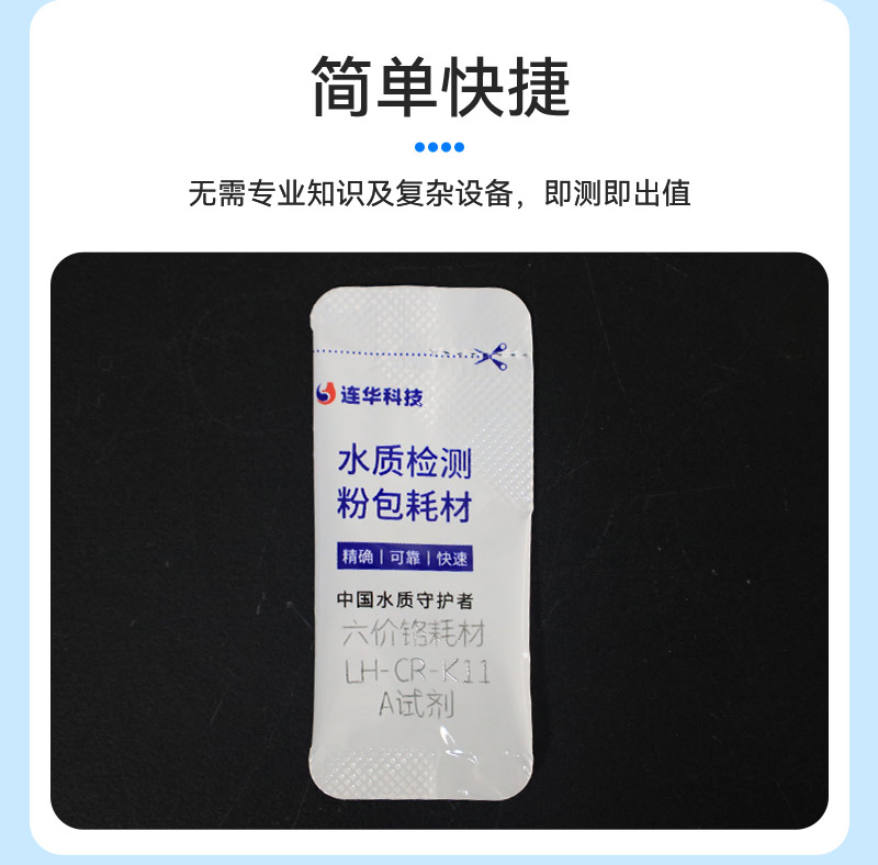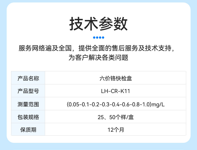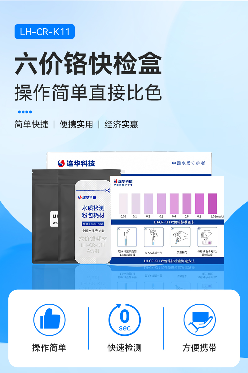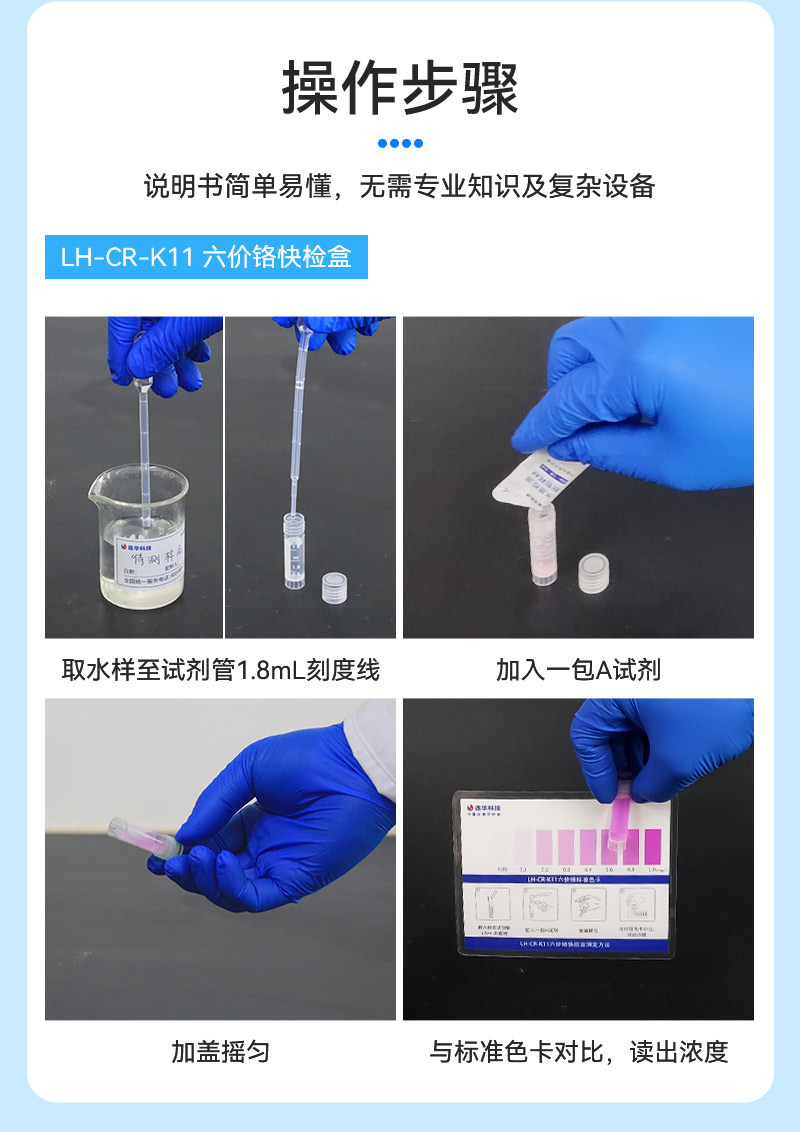 试剂名称:六价铬快检盒试剂型号:LH-CR-K11包装规格:25、50个样/盒量 程:0.05-0.1-0.2-0.3-0.4-0.6-0.8-1.0mg/L保质期:12个月