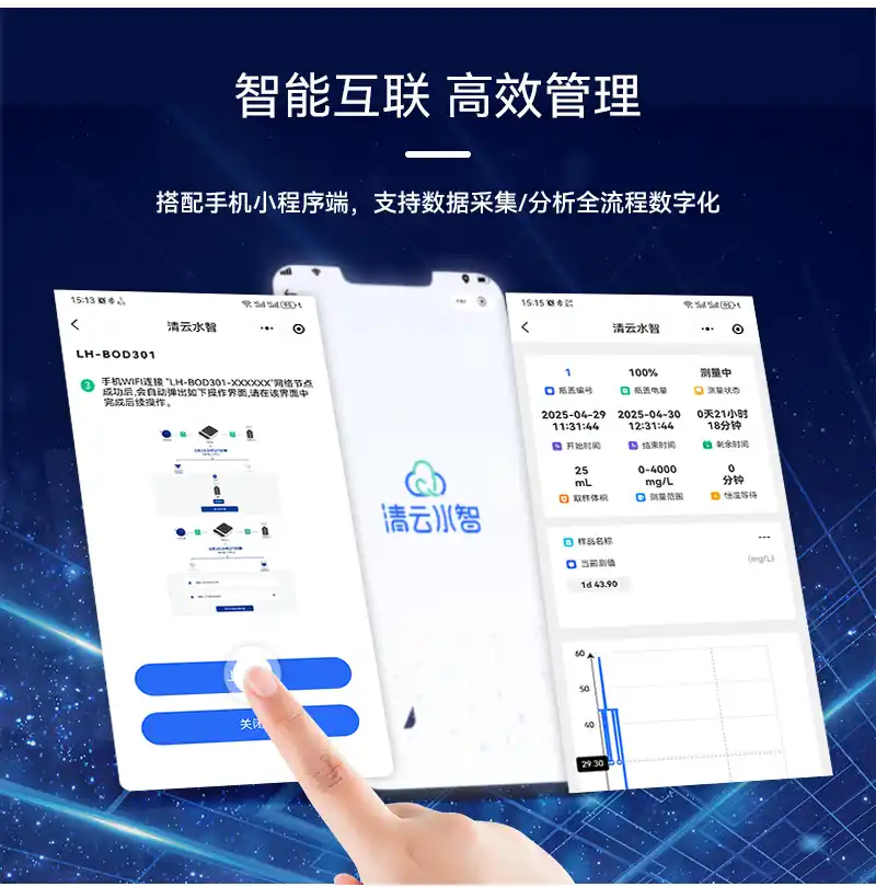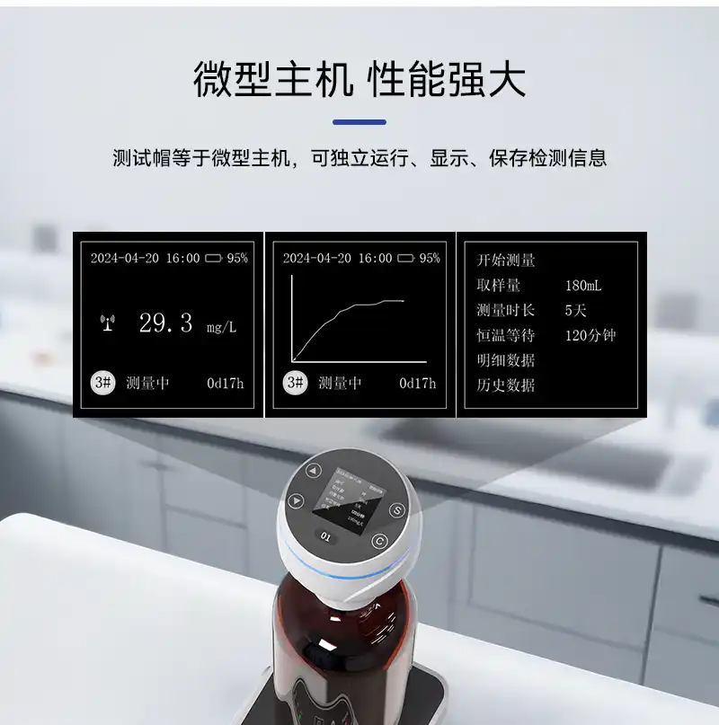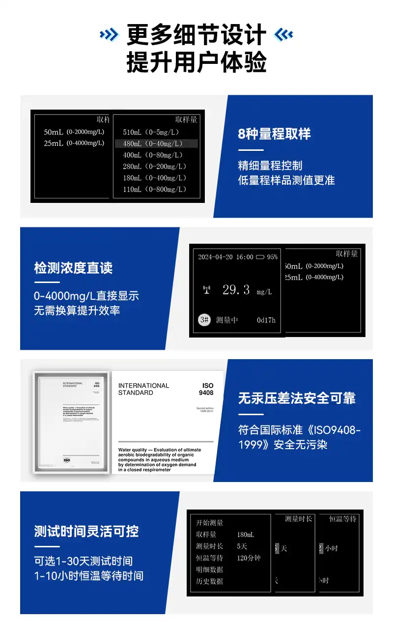2、量程0-4000mg/L,支持8种量程取样选择,检测浓度直读,无需换算直接显示BOD值,硬件升级低量程测值更准;