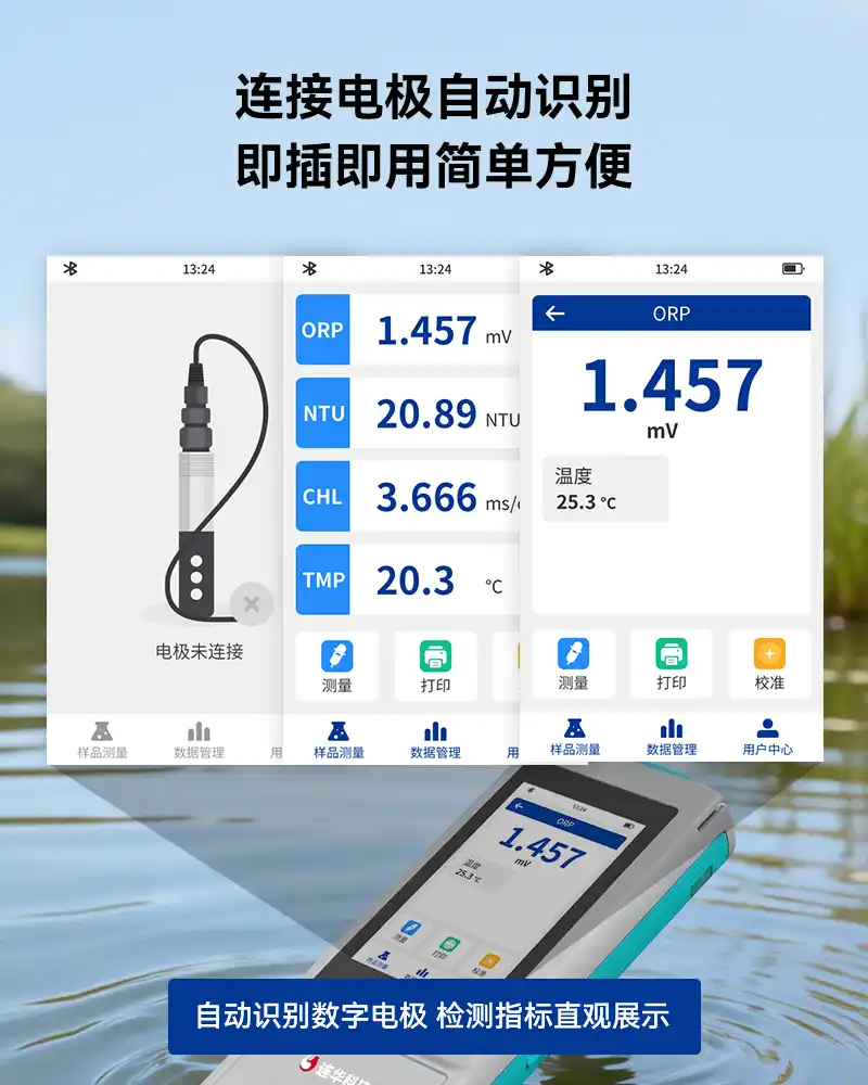3、采用全数字电极,连接电极自动智能识别,支持自动温度补偿,有效避免环境温度影响,提高测值精准度和稳定性;