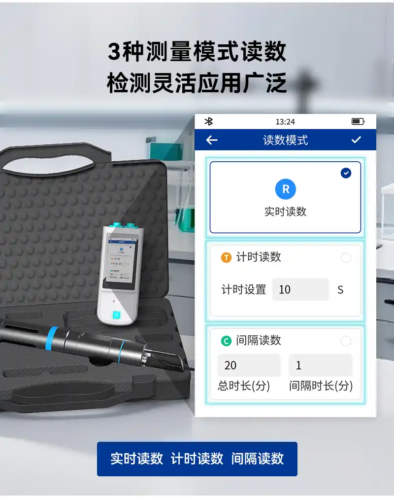 4、内置实时读数、计时读数、间隔读数3种测量模式读数,可根据检测场景及需求灵活选择;