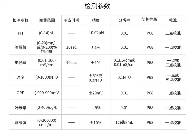 PH、溶解氧、电导率、ORP、浊度、叶绿素、蓝绿藻、TDS、盐度