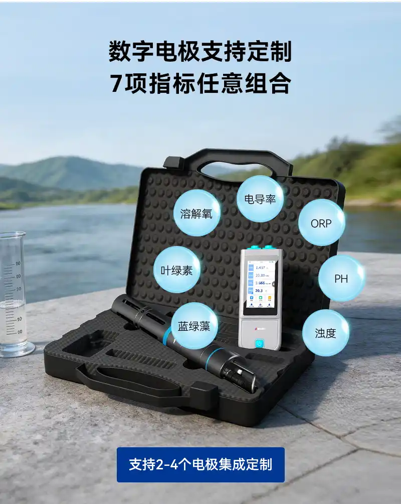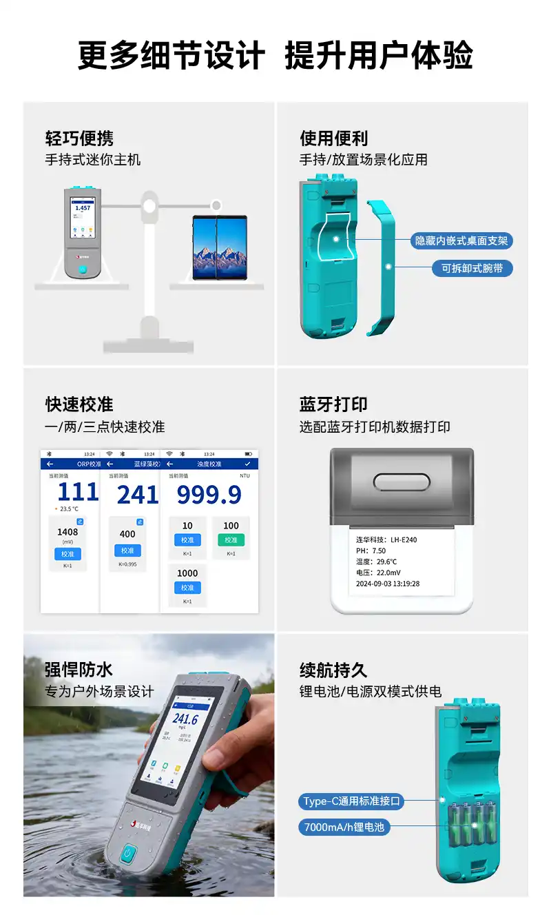 1、手持式迷你主机,支持pH、溶解氧、电导率、ORP、浊度、叶绿素、蓝绿藻7项指标快速检测,满足各领域水质检测需求;