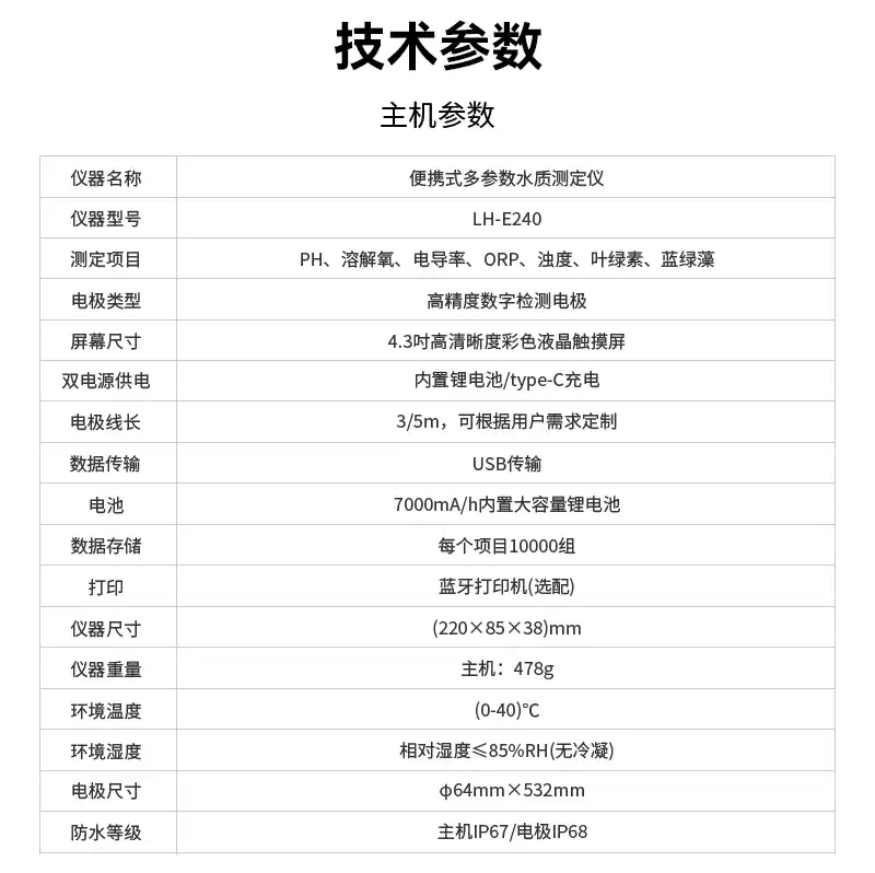便携式多参数水质测定仪LH-E240技术参数: