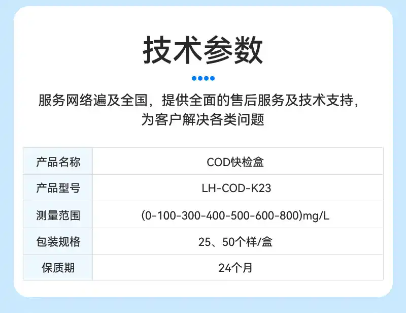试剂名称:COD快检盒试剂型号:LH-COD-K23包装规格:25、50个样/盒量 程:0-100-300-400-500-600-800mg/L保质期:12个月