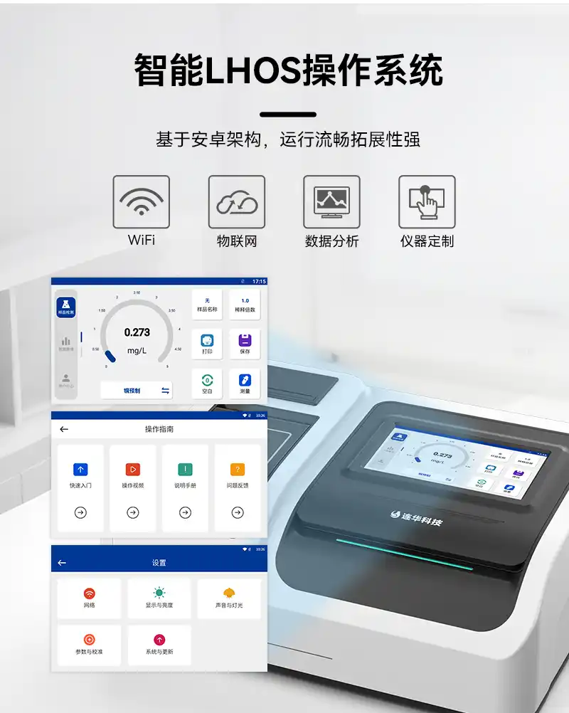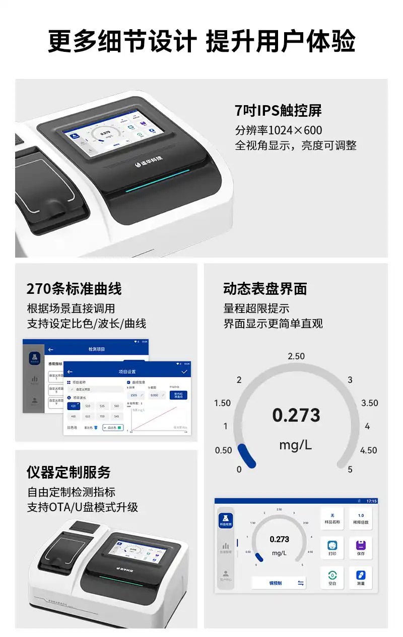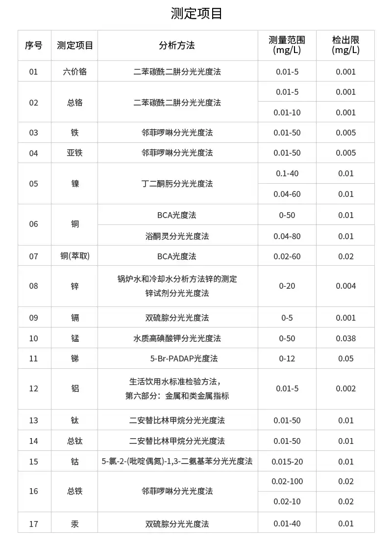 1.快速准确测定六价铬、总铬、镍、铜、锌、铁、铅等多项重金属参数、多种比色方式,浓度直读,自行设定管、皿、波长、曲线;