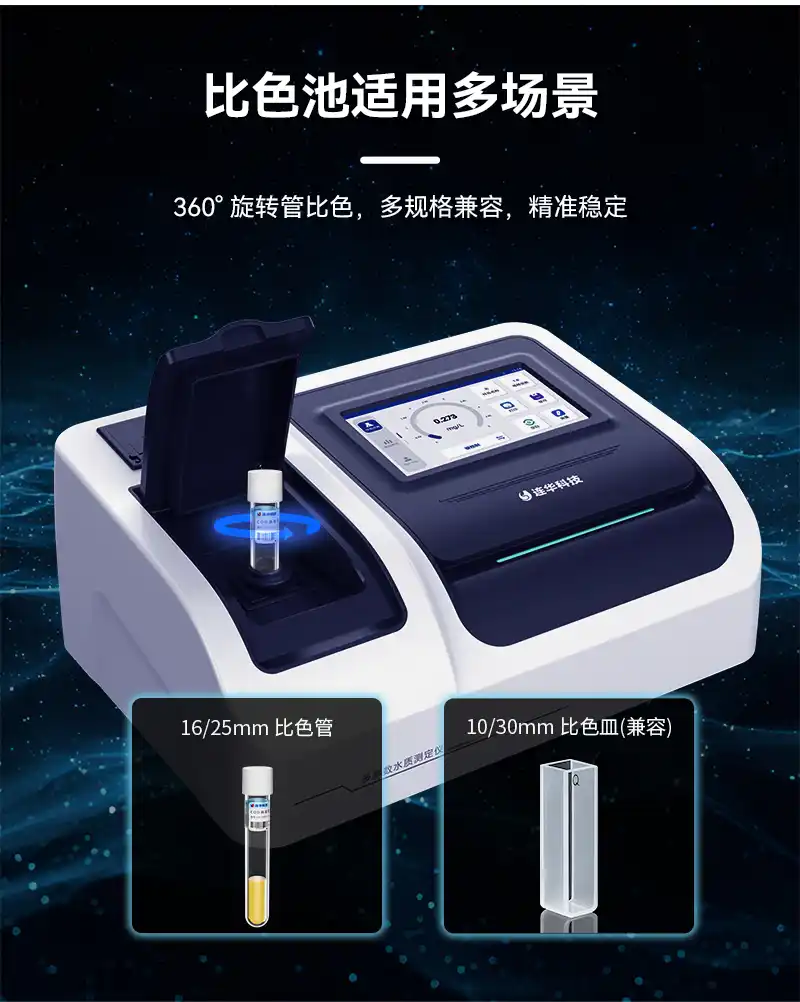 2.360°旋转比色:支持25mm、16mm比色管旋转比色,支持10-30mm比色皿比色;