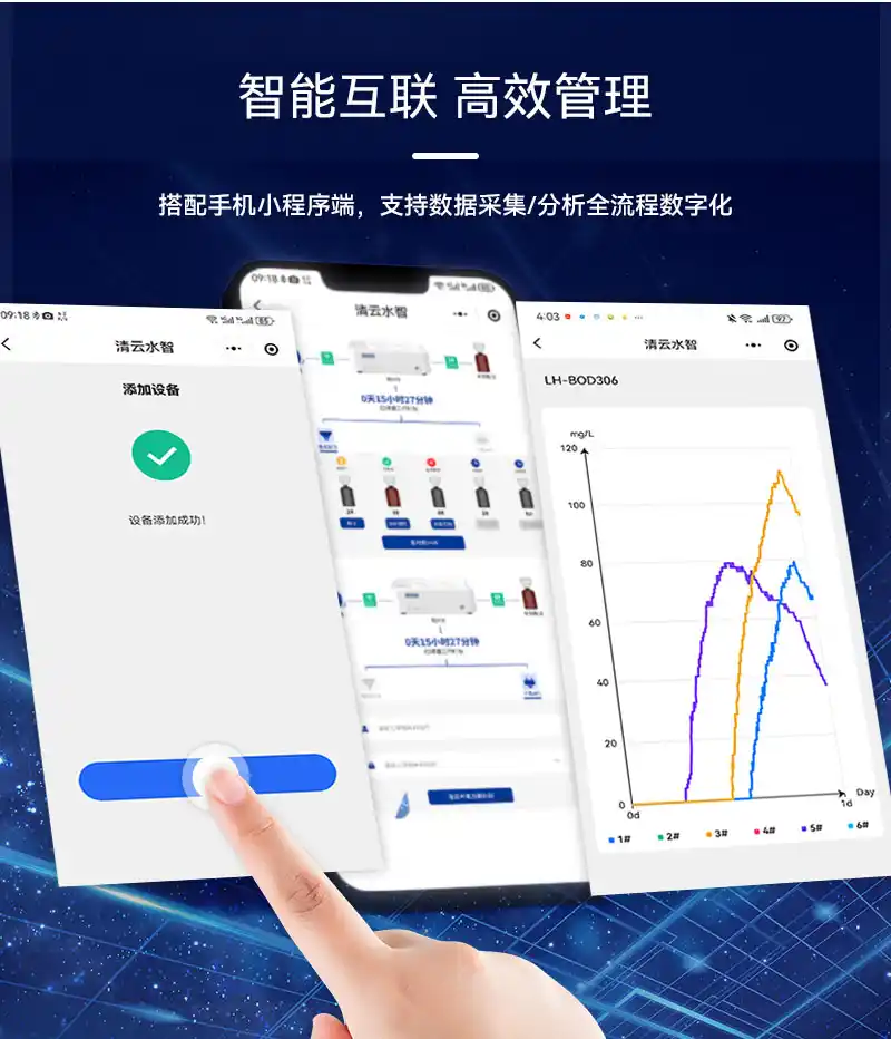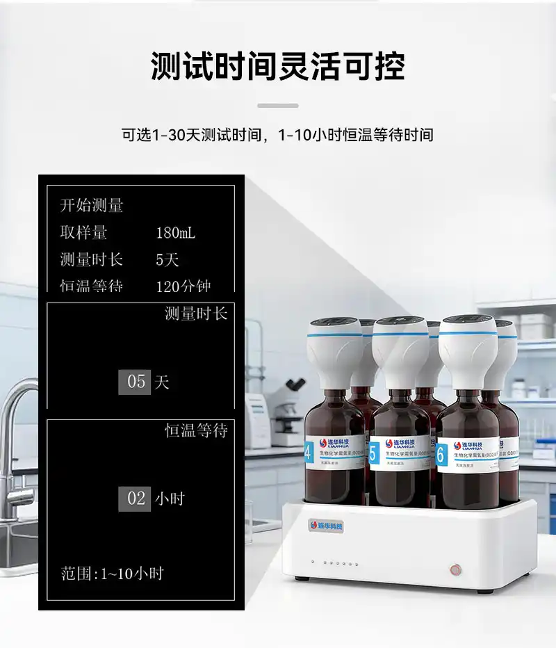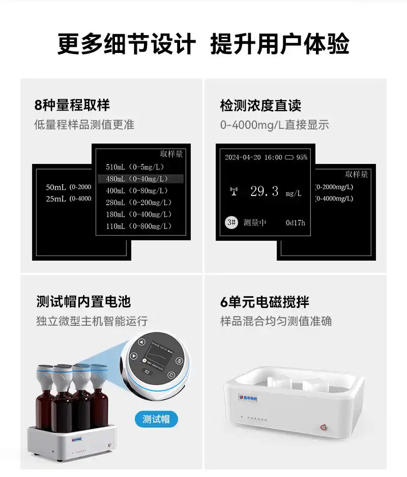 3、量程0-4000mg/L,支持8种量程取样选择,检测浓度直读,无需换算直接显示BOD值,硬件升级低量程测值更准;