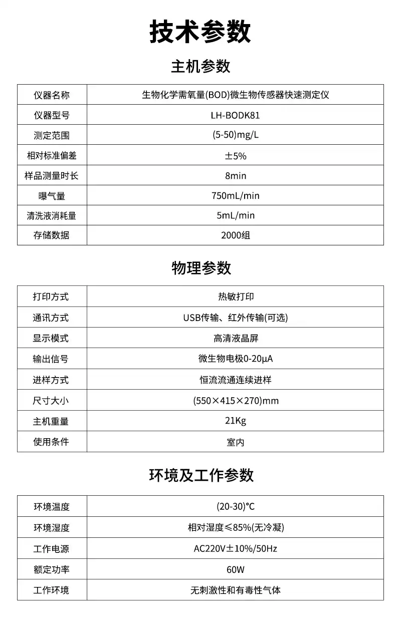 一、主机参数1、仪器名称:生物化学需氧量(BOD)微生物传感器快速测定仪2、产品型号:LH-BODK813、测定范围:(5-50)mg/L(BOD浓度高于50mg/L的水样需稀释后检测)4、相对标准偏差:±5%5、样品测量时长:8min6、清洗液(缓冲溶液)消耗量:5mL/min7、暴气量:750mL/min8、储存数据:2000个二、物理参数1、打印方式:热敏打印2、输出信号:微生物电极0-20μA3、进样方式:恒速流通连续进样4、尺寸大小:550mm×415mm×270mm5、主机重量:21kg6、显示模式:高清液晶屏7、使用条件:室内