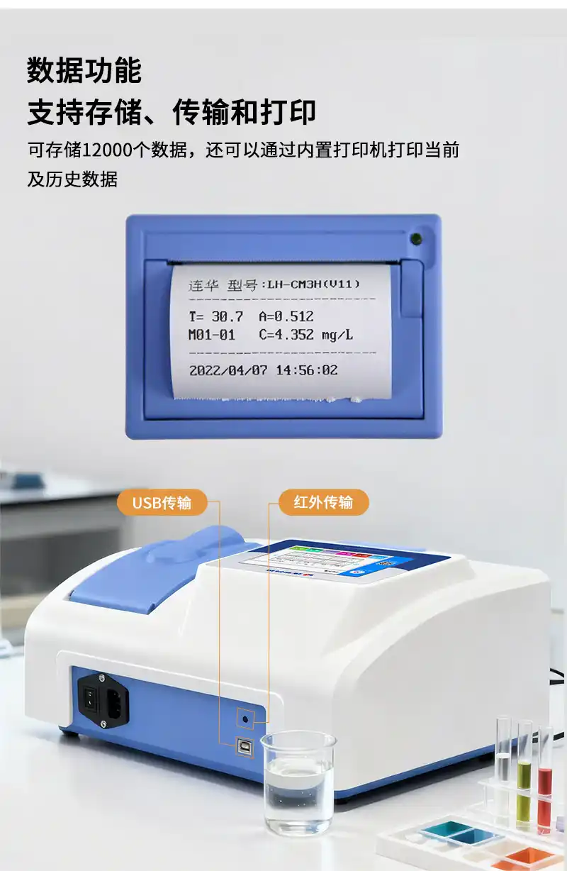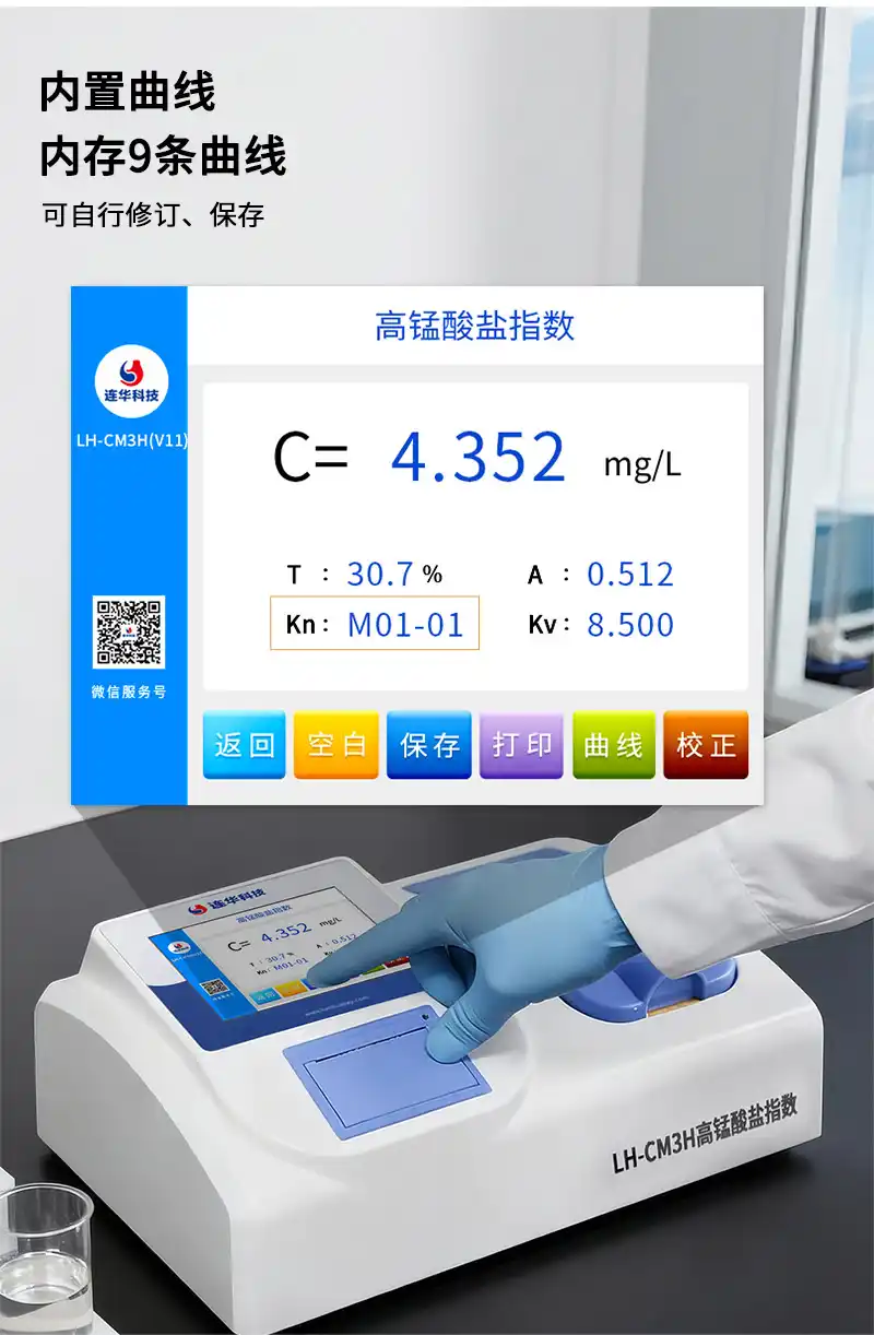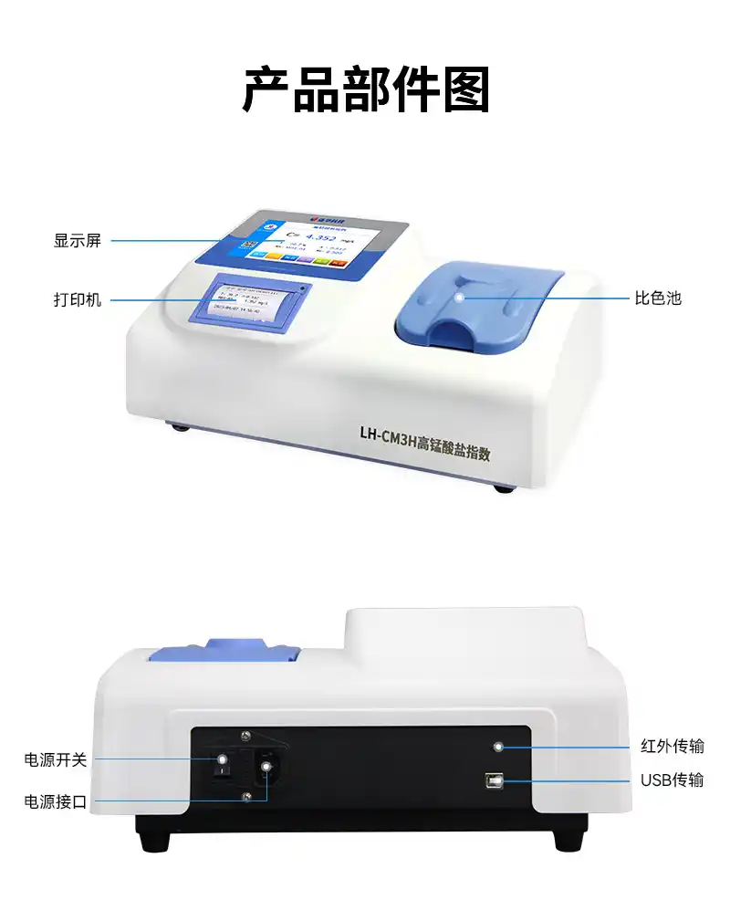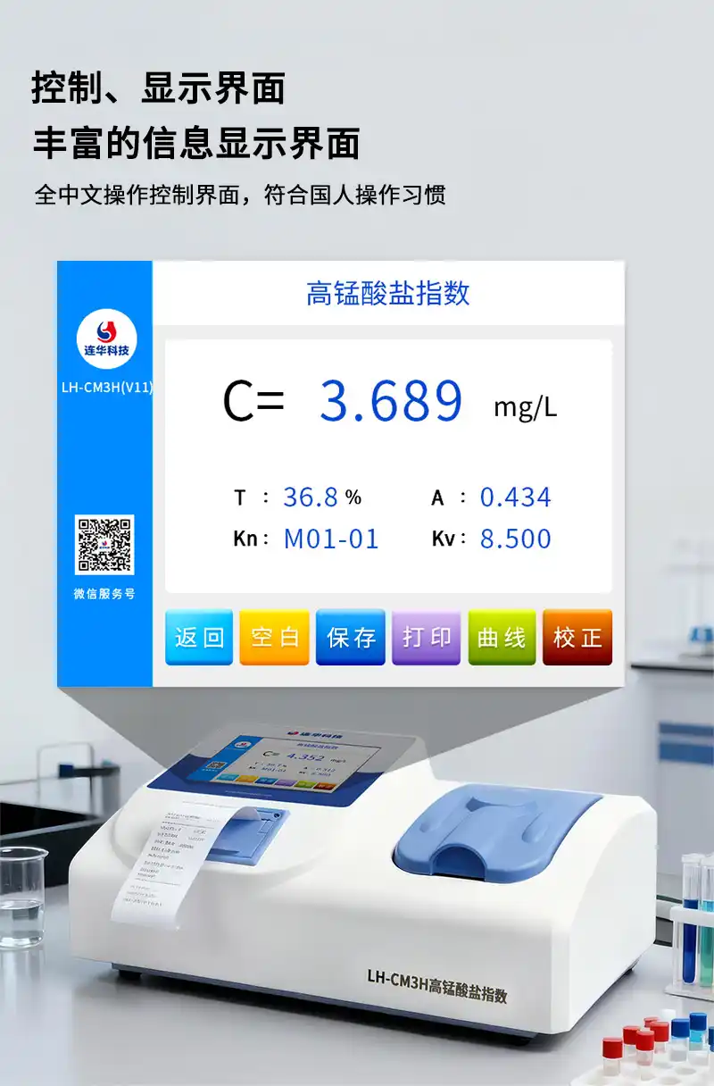 功能特点1、智能化程度高,能直观、快速测定水中高锰酸盐指数2、采用光度法,能准确测定高锰酸盐指数,消除人为误差3、冷光源、窄带干涉,光源寿命达10万小时4、大屏幕液晶显示,丰富的信息显示界面,全中文操作控制界面,符合国人操作习惯5、支持历史数据存储,能存储1000个数据(精确保存测定时间、数据)6、自带打印机,能打印当前数据和历史数据7、内存99条曲线,可自行修订、保存8、仪器可根据标准样品自动制作并保存曲线9、先进的人机交流系统,可向计算机传输当前及历史数据(USB接口)