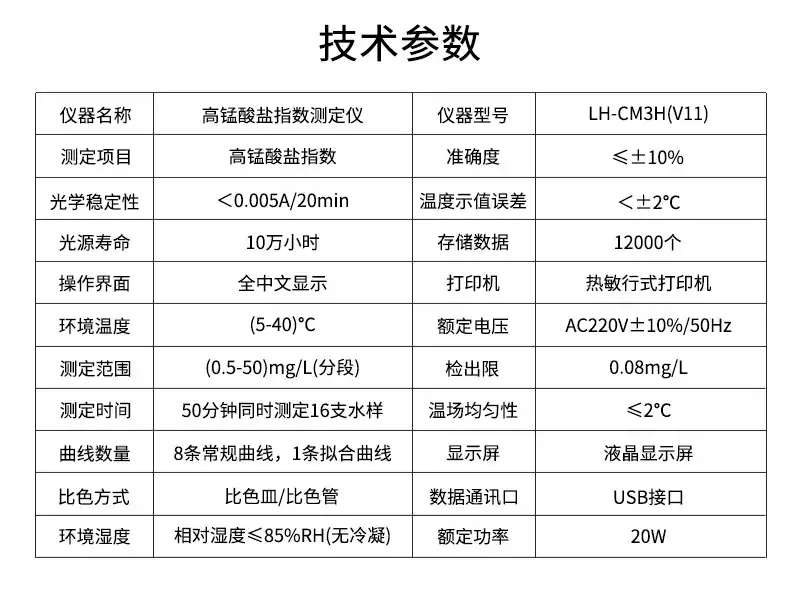 技术参数1、仪器名称:高锰酸盐指数测定仪2、产品型号:LH-CM3H(V11)3、测定项目:高锰酸盐指数4、准确度:≤±10%5、光学稳定性:<0.005A/20min6、温度示值误差:<±2℃7、光源寿命:10万小时8、存储数据:1000个9、操作界面:全中文显示10、打印机:热敏行式打印机11、环境温度:(5-40)℃12、额定电压:AC220V±10%/50Hz13、测定范围:(0.5-50)mg/L(分段)14、检出限:0.08mg/L15、测定时间:50分钟同时测定16支水样16、温场均匀性:≤2℃17、曲线数量:89条常规曲线,10条拟合曲线18、显示屏:液晶显示屏19、比色方式:比色皿/比色管20、数据通讯口:USB接口21、环境温度:相对湿度≤85%RH(无冷凝)22、额定功率:20W