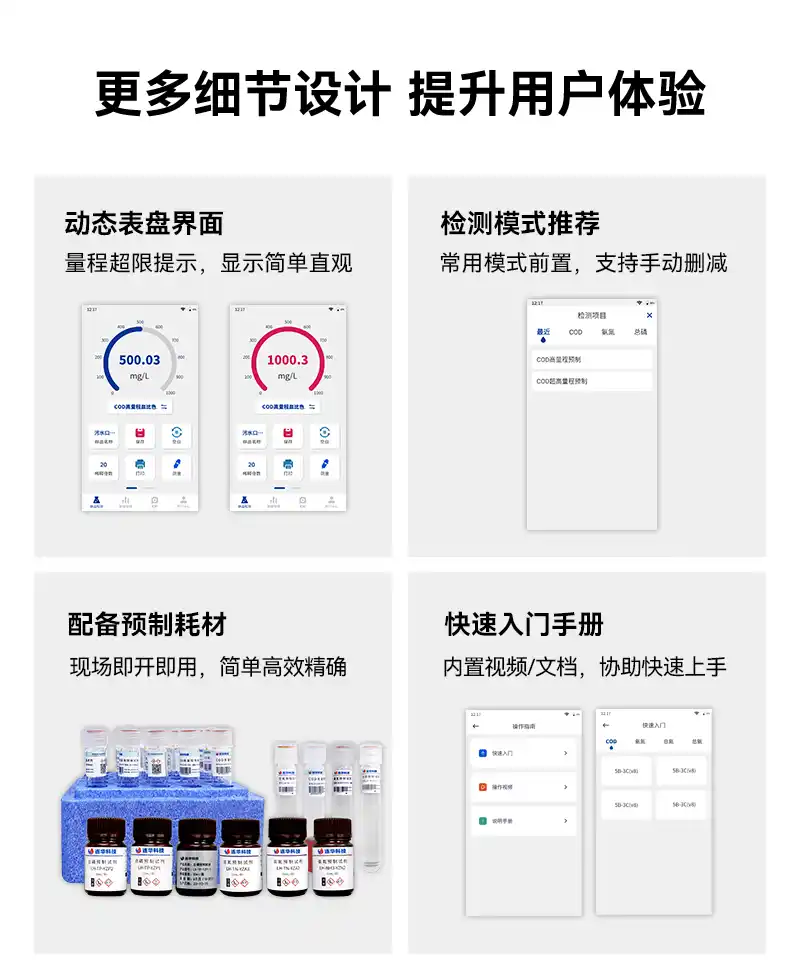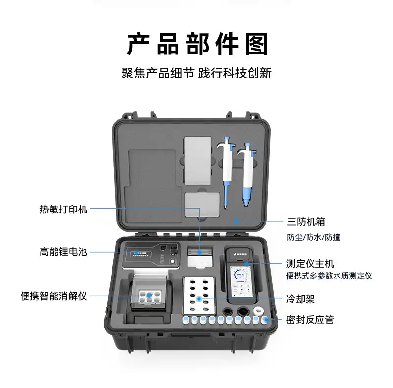 18、产品配套齐全:COD、氨氮、总磷、总氮预制耗材,便携式消解仪,高能锂电池,便携打印机,密封反应管,冷却架,管比色架,移液枪,打印纸等。