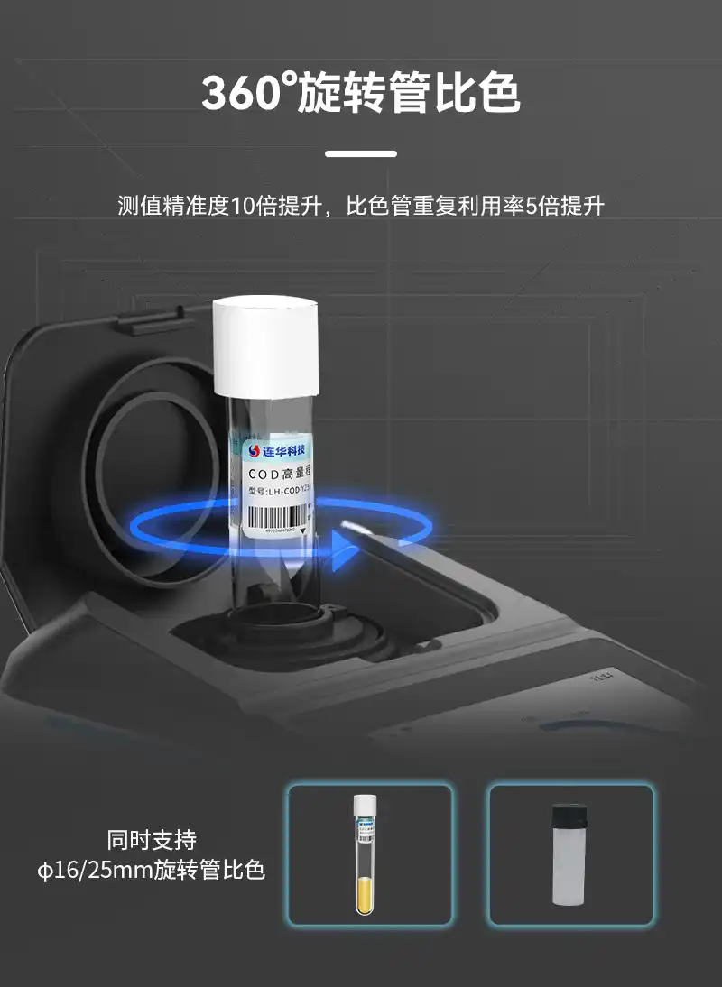 2、采用16mm/25mm比色管360°旋转管比色,可有效提升测值精确度及比色管重复利用率;
