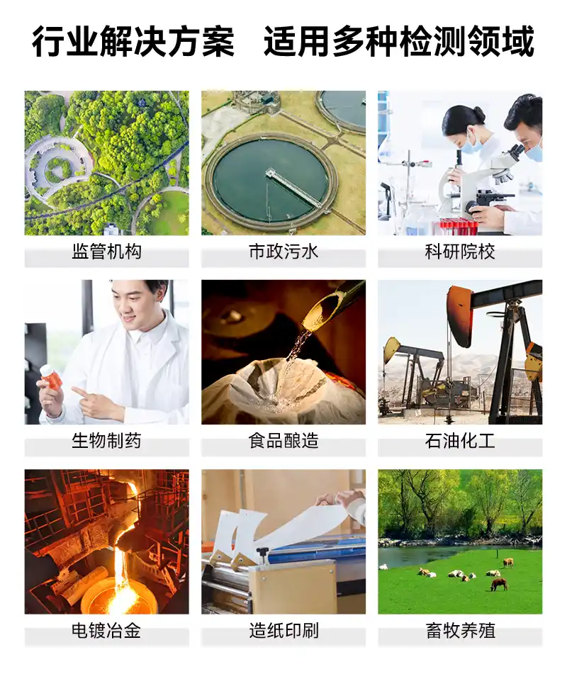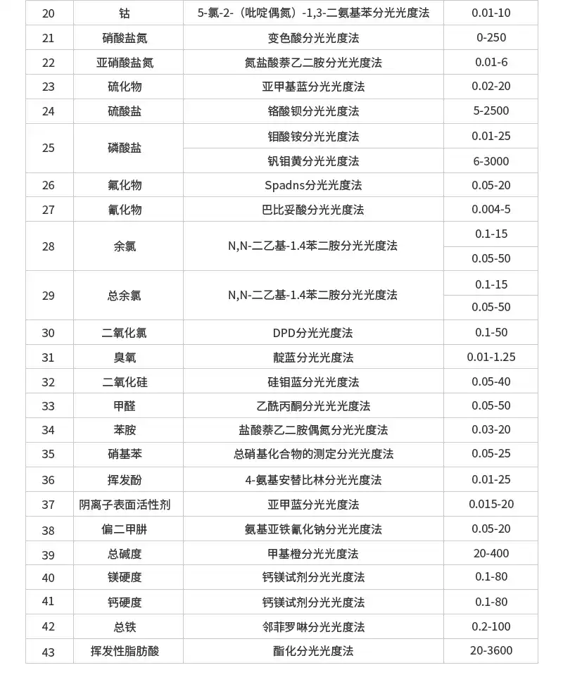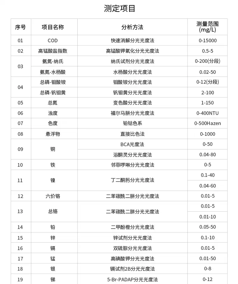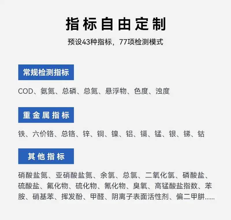 8、可测定化学需氧量(COD)、氨氮、总磷、总氮、悬浮物、色度、浊度、重金属、有机污染物和无机污染物等43项指标,浓度直读;