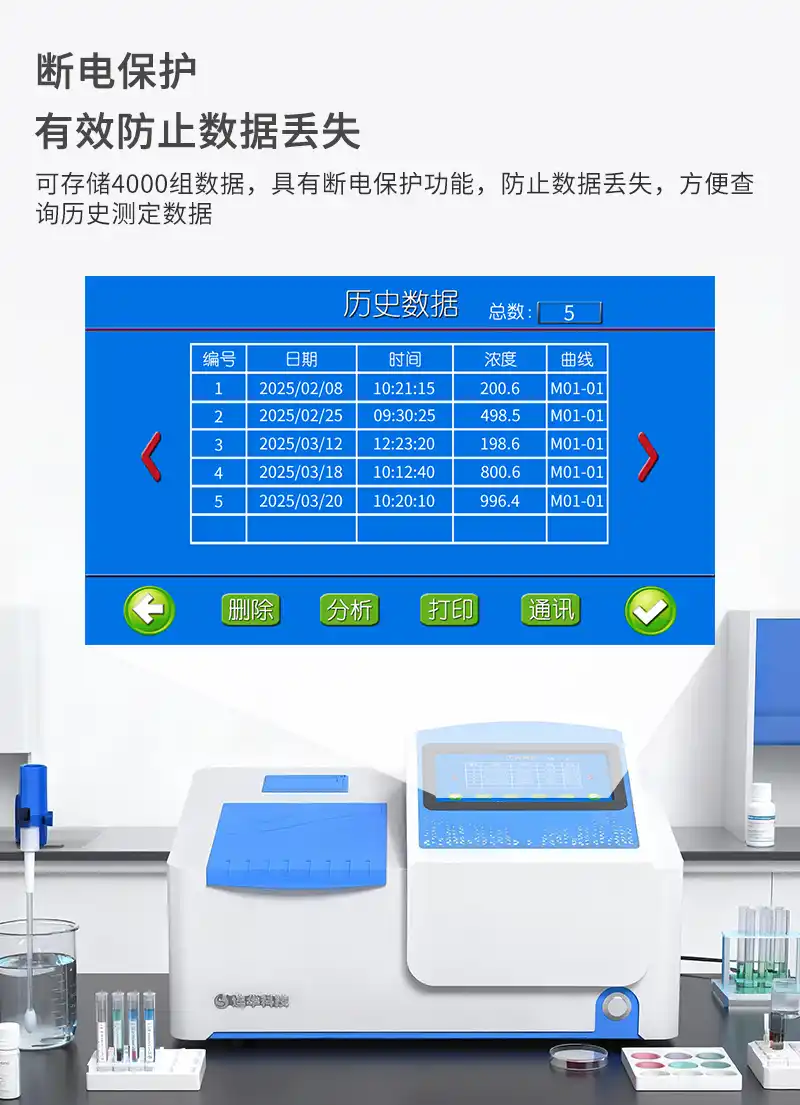 6.断电保护:可存储5000组数据,具有断电保护功能,防止数据丢失,方便查询历史测定数据;
