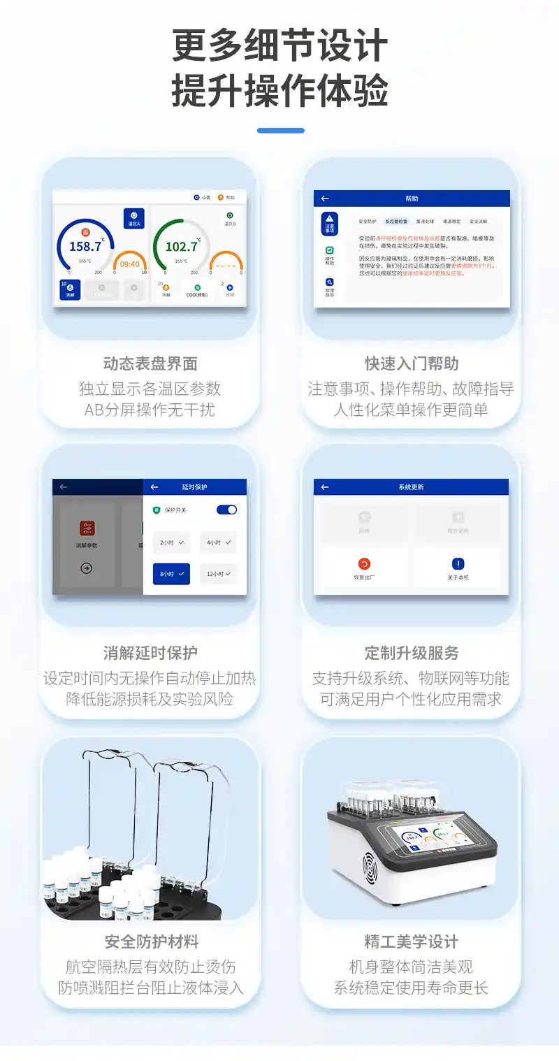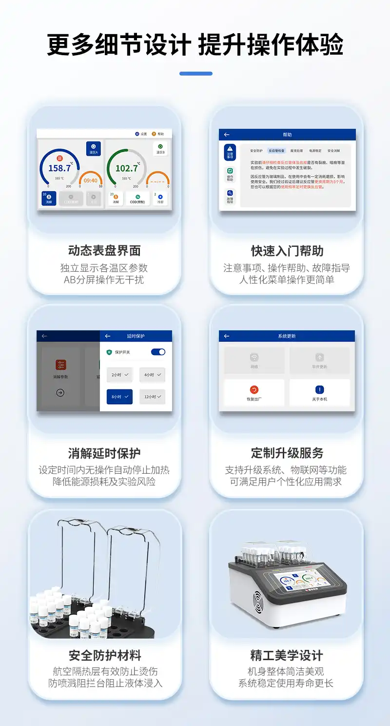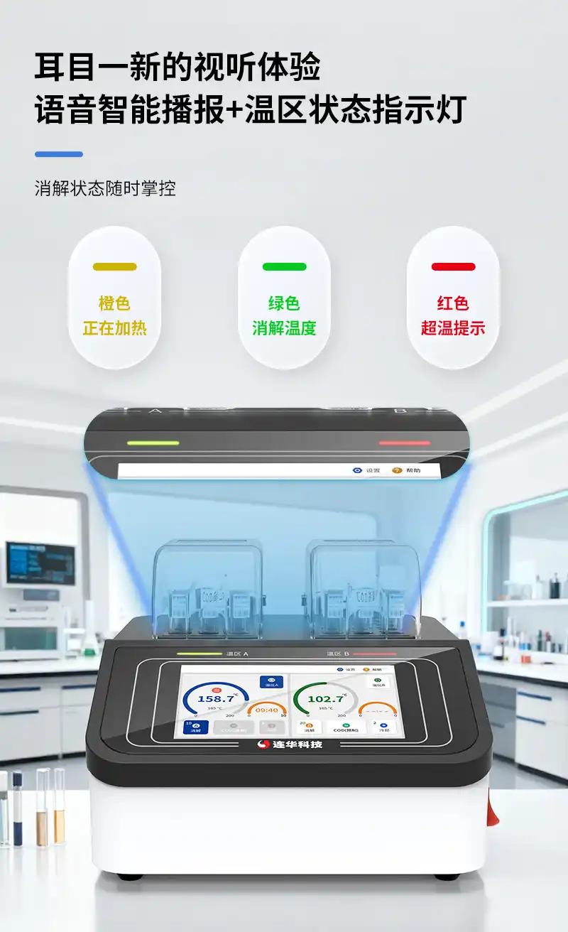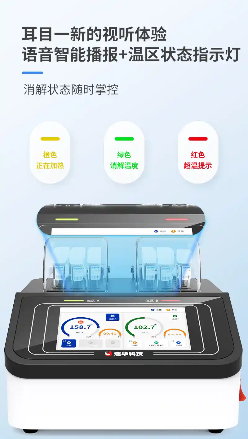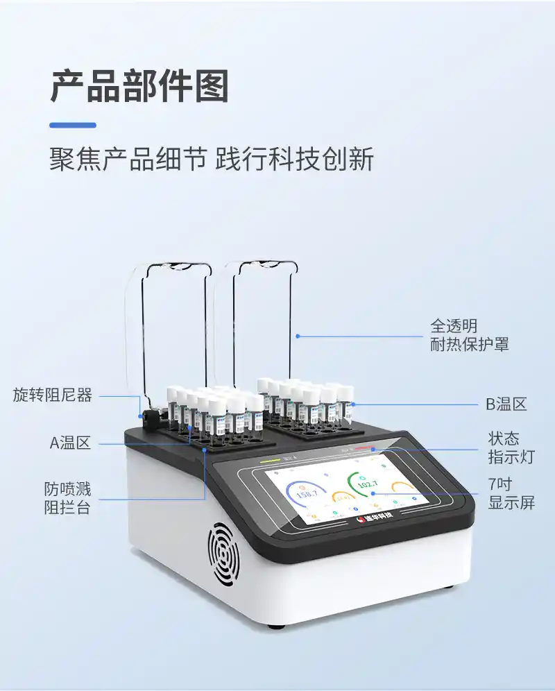 1、双温区加热系统:可同时消解两种不同温度的水样,消解温度到达时自动调整加热功率,节省时间;