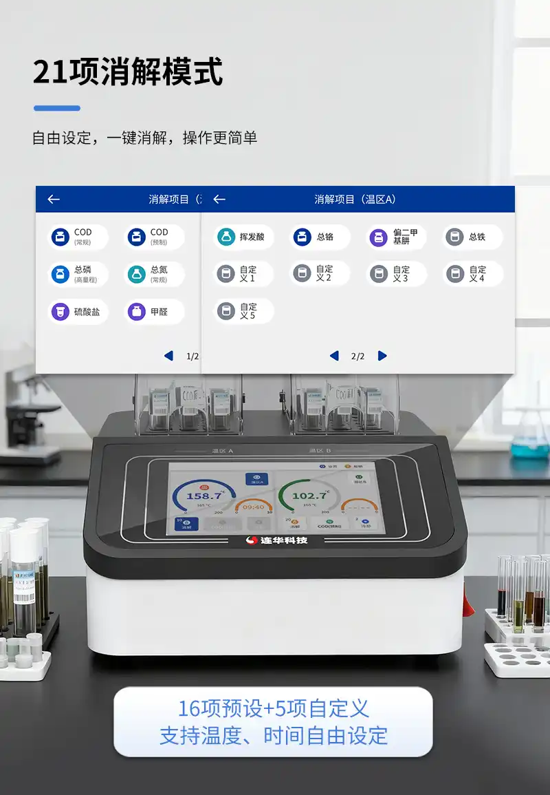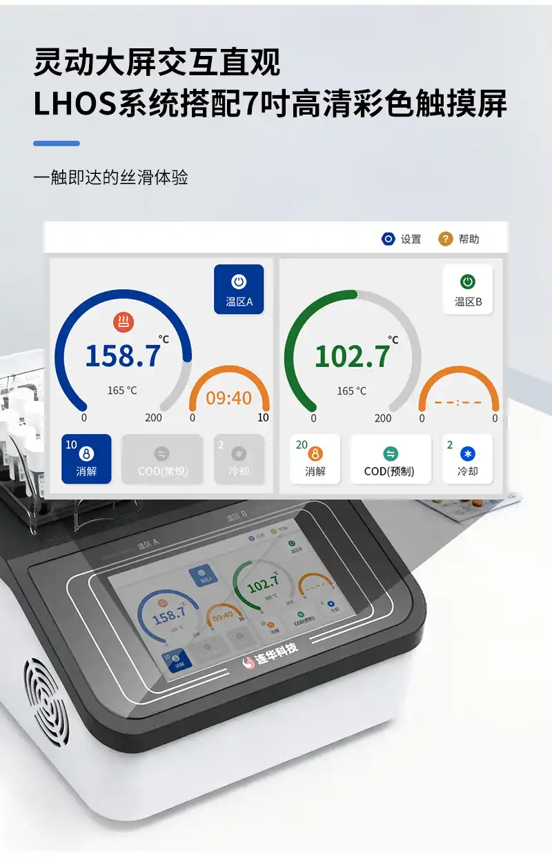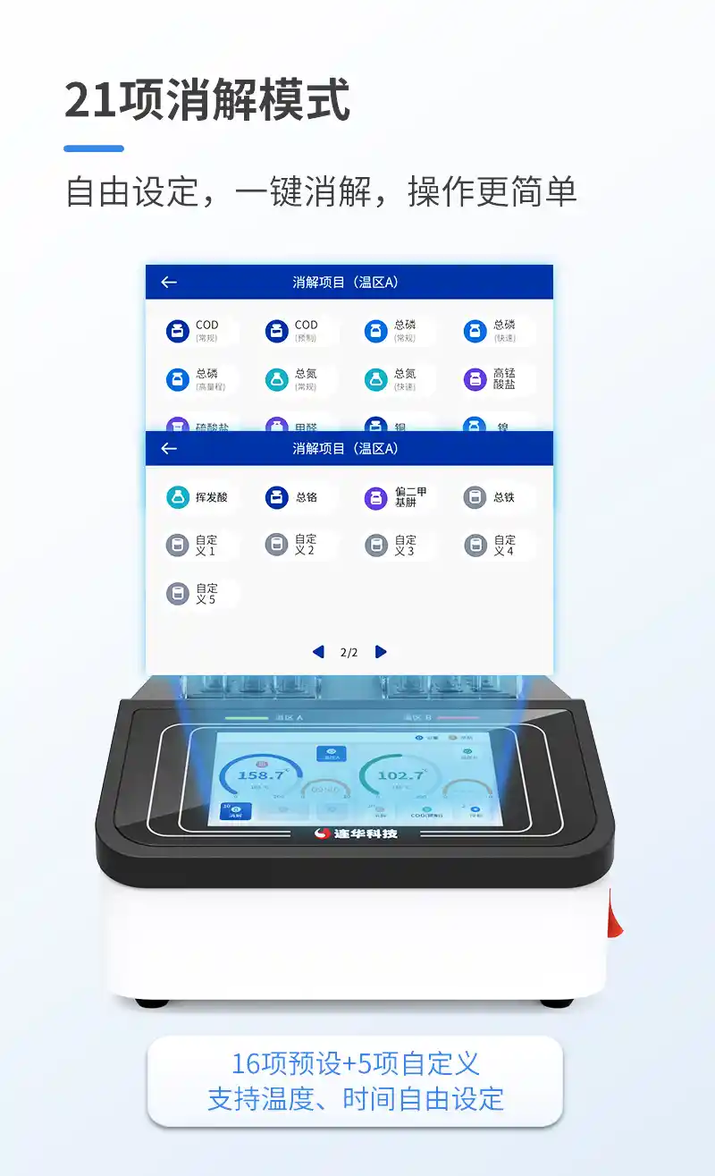 简要描述: 仪器采用30孔独立双温区设计,可以同时进行两个项目的消解,效率翻倍。21项消解模式自由设定,支持温度、时间自由设定,可以灵活应对不同实验条件的水质检测工作。7吋高清彩色触摸屏,搭配了直观的LHOS系统,可以轻松地进行各种设定,支持语音智能播报和温区状态指示灯,消解状态随时掌控。