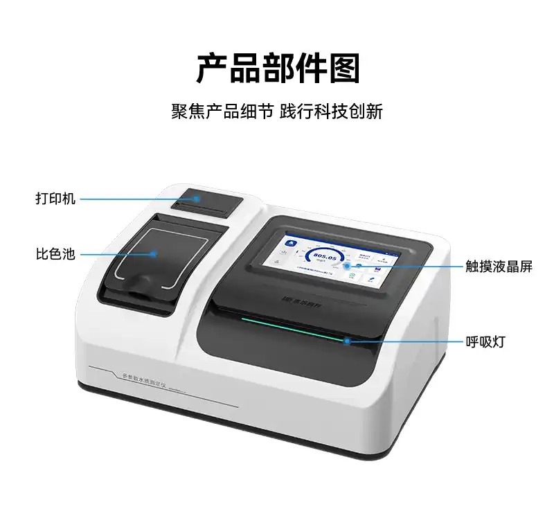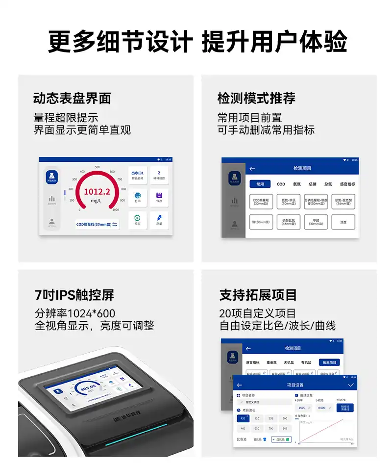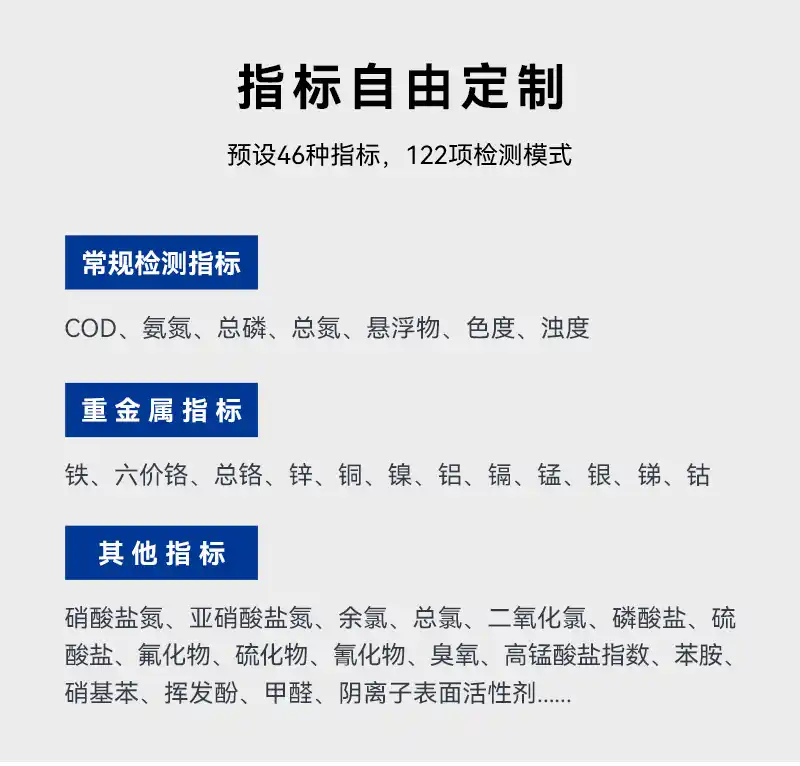 1、专注实验室水质检测,预设122种测量模式,可测定COD、氨氮、总磷、总氮、悬浮物、色度、浊度、重金属、有机污染物和无机污染物等46项指标,浓度直读;