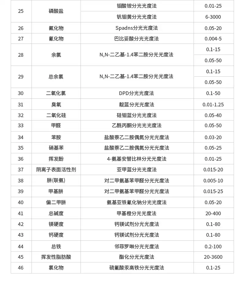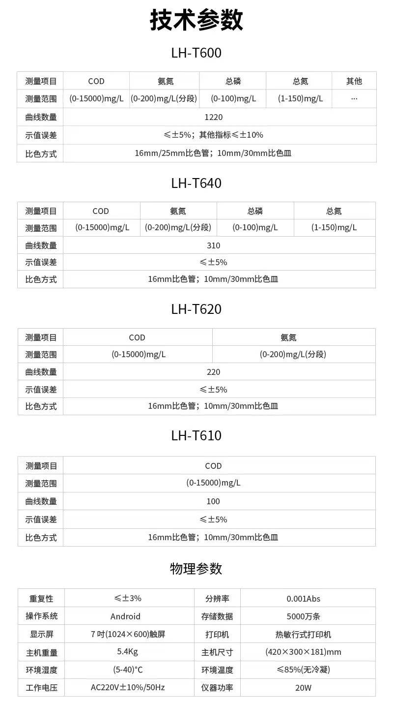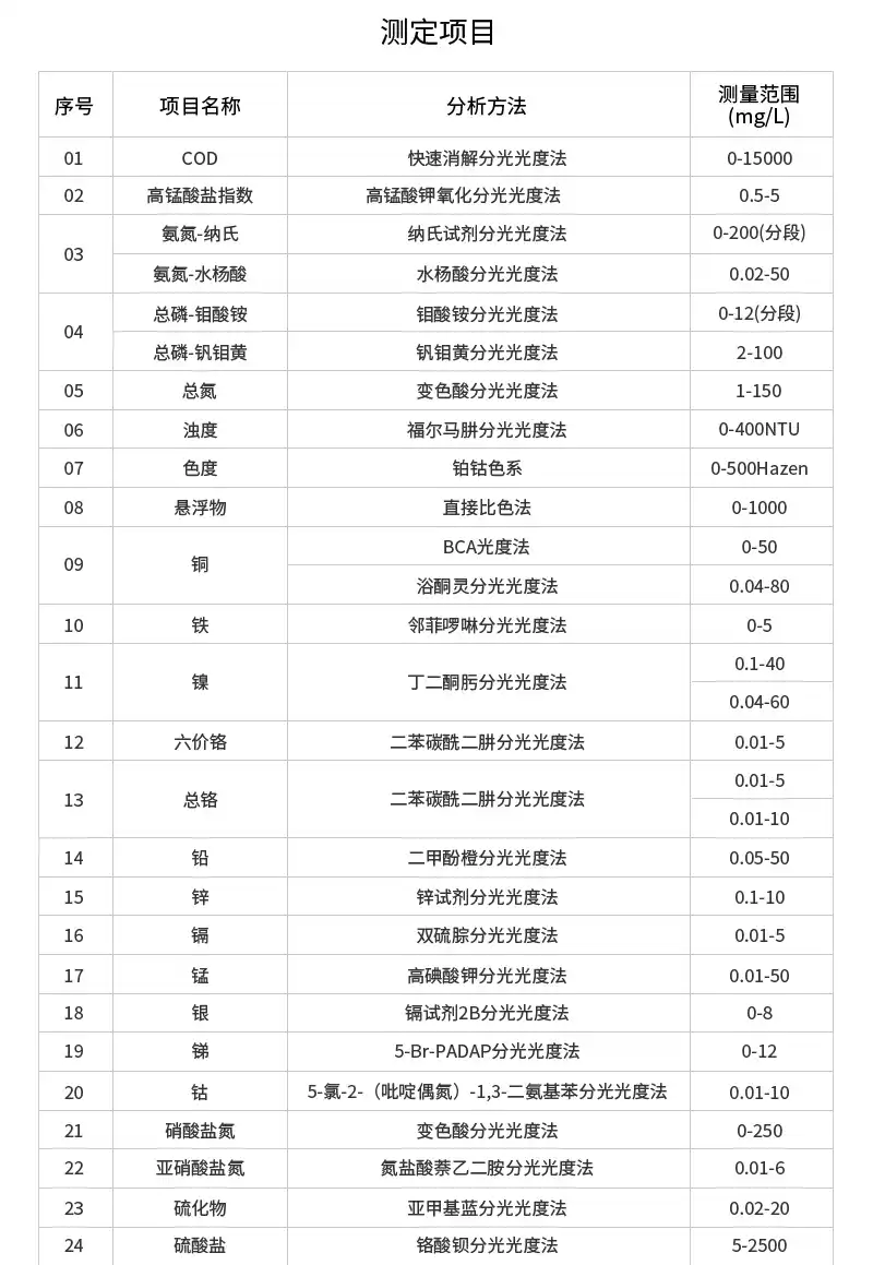 1.测量范围:COD:(0-15000)mg/L氨氮:(0-160)mg/L总磷:(0-100)mg/L总氮:(0-150)mg/L2.示值误差:常规指标≤±5%;其他指标:≤±10%3.分辨率:0.001Abs4.曲线数量:12205.重复性:≤±3%6.比色方式:16mm/25mm比色管10mm/30mm比色皿7.操作系统:基于安卓的LHOS8.显示屏:7吋;1024×600触屏9.存储数据:5000万组10.打印机:热敏行式打印机11.额定电压:AC220V12.主机重量:5.4kg13.主机尺寸:(420×300×181)mm14.环境温度:(5-40)℃15.环境湿度:≤85%(无冷凝)16.功耗:20W三、测定项目COD:分析方法:快速消解分光光度法依据标准:《HJ399-2007》量程范围:COD高量程:预制试剂:(20~15000)mg/L(分段);普通试剂:(20~10000)mg/L(分段)COD低量程:预制试剂:(2~150)mg/L;普通试剂:(2~100)mg/L检测限:COD高量程3mg/L;COD低量程0.5mg/L氨氮1:分析方法:纳氏试剂分光光度法依据标准:《HJ535-2009》量程范围:(0~200)mg/L(分段)检测限:0.01mg/L氨氮2:分析方法:水杨酸分光光度法依据标准:《HJ536-2009》量程范围:高量程:(0.02~50)mg/L;低量程:(0~2.5)mg/L检测限:0.001mg/L总磷:分析方法:钼酸铵分光光度法依据标准:《GB11893-89》量程范围:(0~12)mg/L(分段)检测限:0.002mg/L总磷高量程:分析方法:钒钼黄分光光度法依据标准:《GB/T21931.3-2008》量程范围:(2~100)mg/L检测限:0.5mg/L总氮:分析方法:变色酸分光光度法量程范围:(1~150)mg/L(分段)检测限:0.5mg/L浊度:分析方法:福尔马肼分光光度法量程范围:(0~400)NTU检测限:0.5NTU色度:分析方法:铂钴色系量程范围:(0~500)Hazen检测限:2Hazen悬浮物:分析方法:直接比色法量程范围:(0~1000)mg/L检测限:1mg/L硝酸盐氮:分析方法:变色酸分光光度法量程范围:(0~250)mg/L检测限:0.1mg/L亚硝酸盐氮:分析方法:盐酸萘乙二胺分光光度法量程范围:(0.01~0.6)mg/L检测限:0.003mg/L余氯和总氯:分析方法:N,N-二乙基-1.4苯二胺分光光度法量程范围:(0.05~50)mg/L检测限:0.015mg/L二氧化氯:分析方法:DPD分光光度法量程范围:(0.1~50)mg/L检测限:0.03mg/L二氧化硅:分析方法:硅钼蓝分光光度法量程范围:(0.05~40)mg/L检测限:0.015mg/L磷酸盐钼酸铵光度法::分析方法:钼酸铵分光光度法量程范围:(0.01~25)mg/L检测限:0.005mg/L磷酸盐钒钼黄光度法:分析方法:钒钼黄分光光度法量程范围:(6~3000)mg/L检测限:2mg/L硫酸盐:分析方法:铬酸钡分光光度法量程范围:(5~2500)mg/L检测限:3mg/L氟化物:分析方法:Spadns分光光度法量程范围:(0.05~20)mg/L检测限:0.015mg/L硫化物:分析方法:亚甲蓝分光光度法量程范围:(0.02~20)mg/L检测限:0.002mg/L氰化物:分析方法:异烟酸-巴比妥酸分光光度法量程范围:(0.004~5)mg/L检测限:0.004mg/L臭氧:分析方法:靛蓝光度法量程范围:(0.01-1.25)mg/L检测限:0.003mg/L铁:分析方法:邻菲啰啉分光光度法量程范围:(0~5)mg/L检测限:0.004mg/L六价铬:分析方法:二苯碳酰二肼分光光度法量程范围:(0.01~5)mg/L检测限:0.001mg/L总铬苯偕肼光度法:分析方法:二苯碳酰二肼分光光度法量程范围:(0.01~10)mg/L/(0.01~5)mg/L检测限:0.003mg/L锌:分析方法:锌试剂分光光度法量程范围:(0.1~10)mg/L检测限:0.003mg/L铜BCA法:分析方法:BCA分光光度法量程范围:(0~50)mg/L检测限:0.01mg/L铜浴酮灵法:分析方法:浴酮灵分光光度法量程范围:(0.04~80)mg/L检测限:0.01mg/L镍丁二酮光度法:分析方法:丁二酮肟分光光度法量程范围:(0.1~40)mg/L检测限:0.009mg/L镍丁二肟光度法:分析方法:丁二肟分光光度法量程范围:(0.04~60)mg/L检测限:0.01mg/L铅:分析方法:二甲酚橙分光光度法量程范围:(0.05~50)mg/L检测限:0.01mg/L镉:分析方法:双硫腙分光光度法量程范围:(0.01~5)mg/L检测限:0.002mg/L锰:分析方法:高碘酸钾氧化分光光度法量程范围:(0.01~50)mg/L检测限:0.038mg/L银:分析方法:镉试剂2B分光光度法量程范围:(0~8)mg/L检测限:0.003mg/L锑:分析方法:5-Br-PADAP光度法量程范围:(0~12)mg/L检测限:0.05mg/L钴:分析方法:5-氯-2-(吡啶偶氮)-1,3-二氨基苯光度法量程范围:(0.01-10)mg/L检测限:0.003mg/L苯胺:分析方法:盐酸萘乙二胺分光光度法量程范围:(0.03~20)mg/L检测限:0.002mg/L硝基苯:分析方法:盐酸萘乙二胺分光光度法量程范围:(0.05~25)mg/L检测限:0.007mg/L挥发酚:分析方法:4-氨基安替比林分光光度法量程范围:(0.01~25)mg/L检测限:0.005mg/L甲醛:分析方法:乙酰丙酮分光光度法量程范围:(0.05~50)mg/L检测限:0.003mg/L阴离子表面活性剂:分析方法:亚甲蓝分光光度法量程范围:(0.015~20)mg/L检测限:0.01mg/L高锰酸盐指数:分析方法:高锰酸钾氧化分光光度法量程范围:(0.5~5)mg/L检测限:0.5mg/L肼(联氨):分析方法:对二甲氨基苯甲醛分光光度法量程范围:(0.005~10)mg/L检测限:0.002mg/L甲基肼:分析方法:对二甲氨基苯甲醛分光光度法量程范围:(0.015~25)mg/L检测限:0.005mg/L偏二甲肼:分析方法:氨基亚铁氰化钠分光光度法量程范围:(0.05~20)mg/L检测限:0.015mg/L总碱度:分析方法:甲基橙分光光度法量程范围:(20~400)mg/L检测限:6mg/L镁硬度/钙硬度:分析方法:钙镁试剂分光光度法量程范围:(0.1~80)mg/L检测限:0.03mg/L总铁:分析方法:邻菲罗啉分光光度法量程范围:(0.2~100)mg/L检测限:0.05mg/L挥发性脂肪酸:分析方法:酯化分光光度法量程范围:(20~3600)mg/L检测限:5mg/L氯化物:分析方法:硫氰酸汞高铁分光光度法量程范围:(0.1~25)mg/L检测限:0.03mg/L