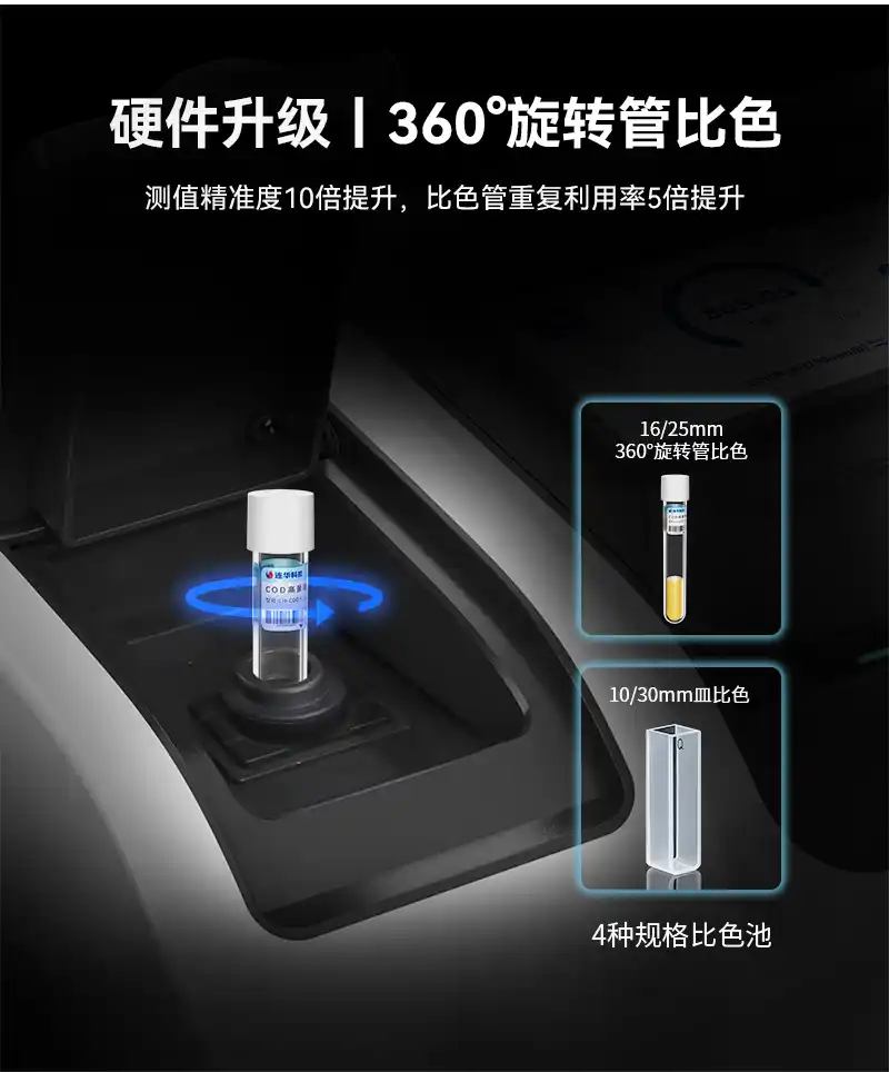 13、4种规格比色池支持16/25mm管比色和10/30mm皿比色,支持360°旋转管比色,可有效提升测值精确度及比色管重复利用率;