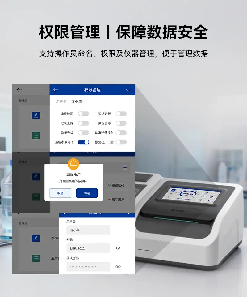 8、内置用户管理系统,支持操作员命名、权限及仪器管理,只有权限用户才能修改部分重要参数,便于管理、保障数据安全;
