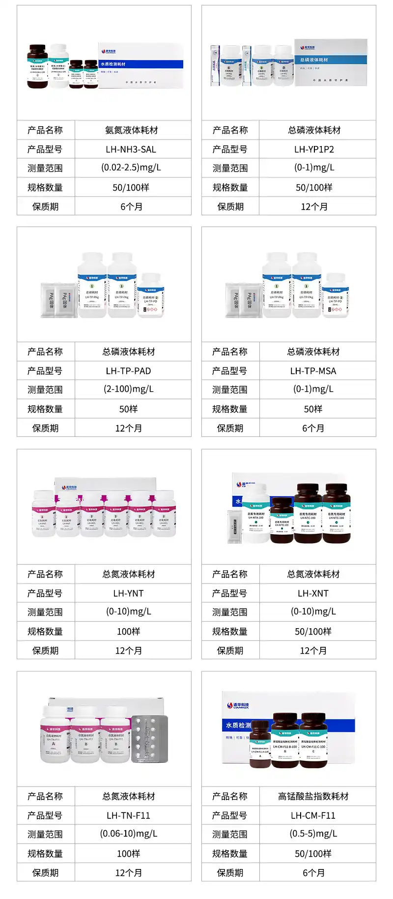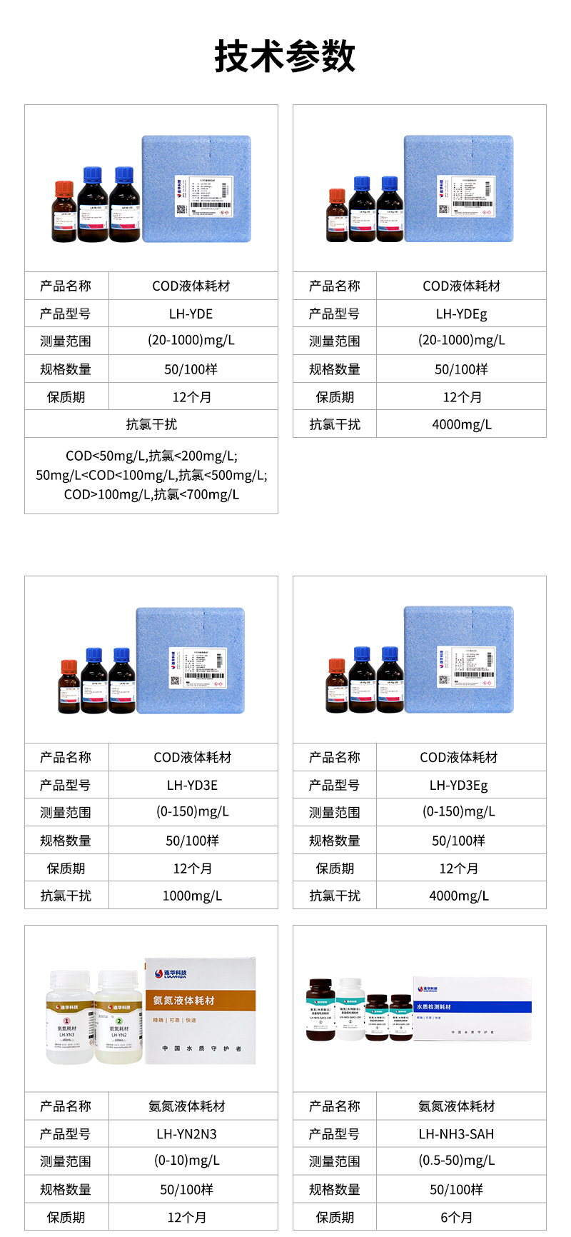 液体试剂技术参数LH-YDE测量范围:20-1000mg/L测量精度:±8%(≤50mg/L);±5%(>50mg/L)规格数量:50、100样保质期:12个月