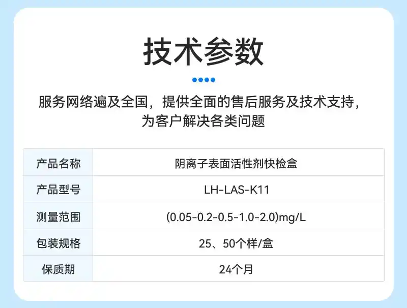 试剂名称:阴离子表面活性剂快检盒试剂型号:LH-LAS-K11包装规格:25、50个样/盒量 程:0.05-2mg/L保质期:24个月