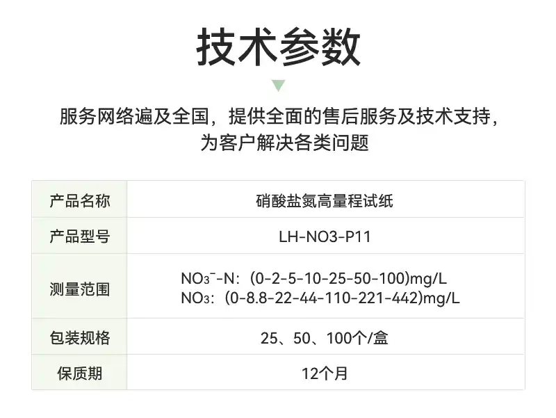 试剂名称:硝酸盐氮试纸(高量程)试剂型号:LH-NO3-P11包装规格:25、50、100个样/盒量 程:NO3-N:0-2-5-10-25-50-100 NO3:0-8.8-22-44-110-221-442保质期:12个月