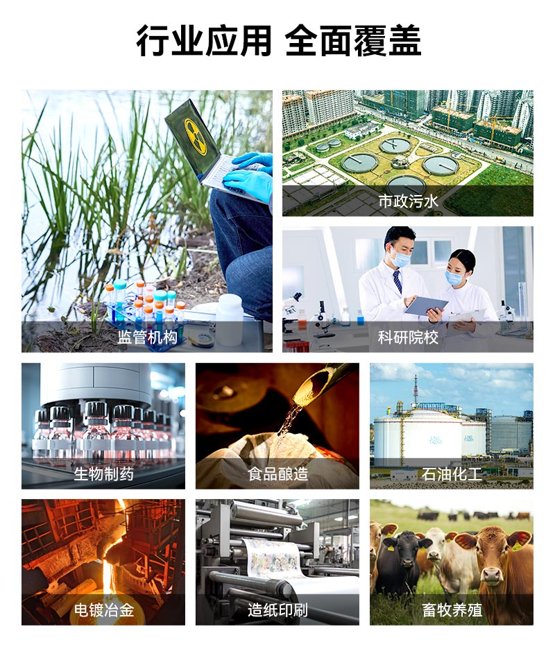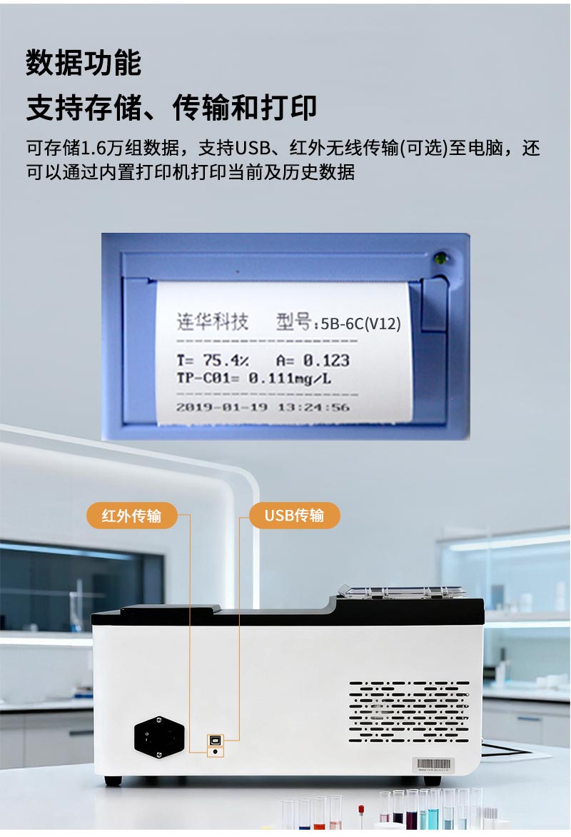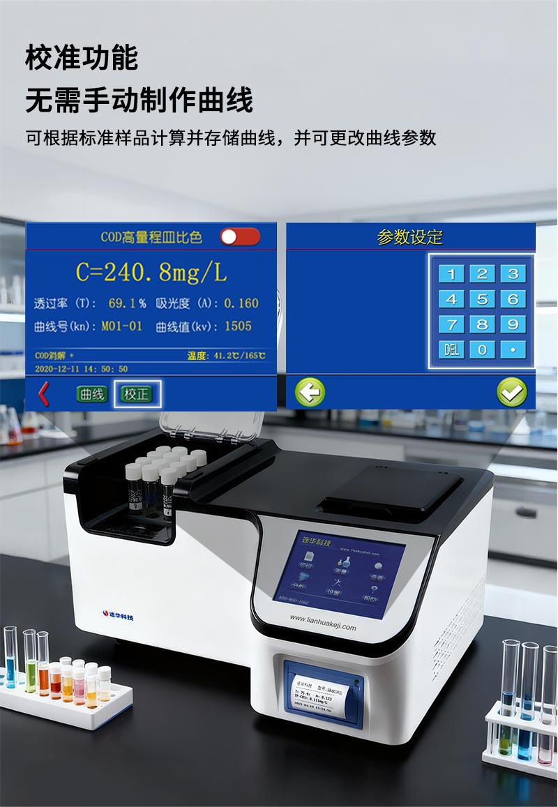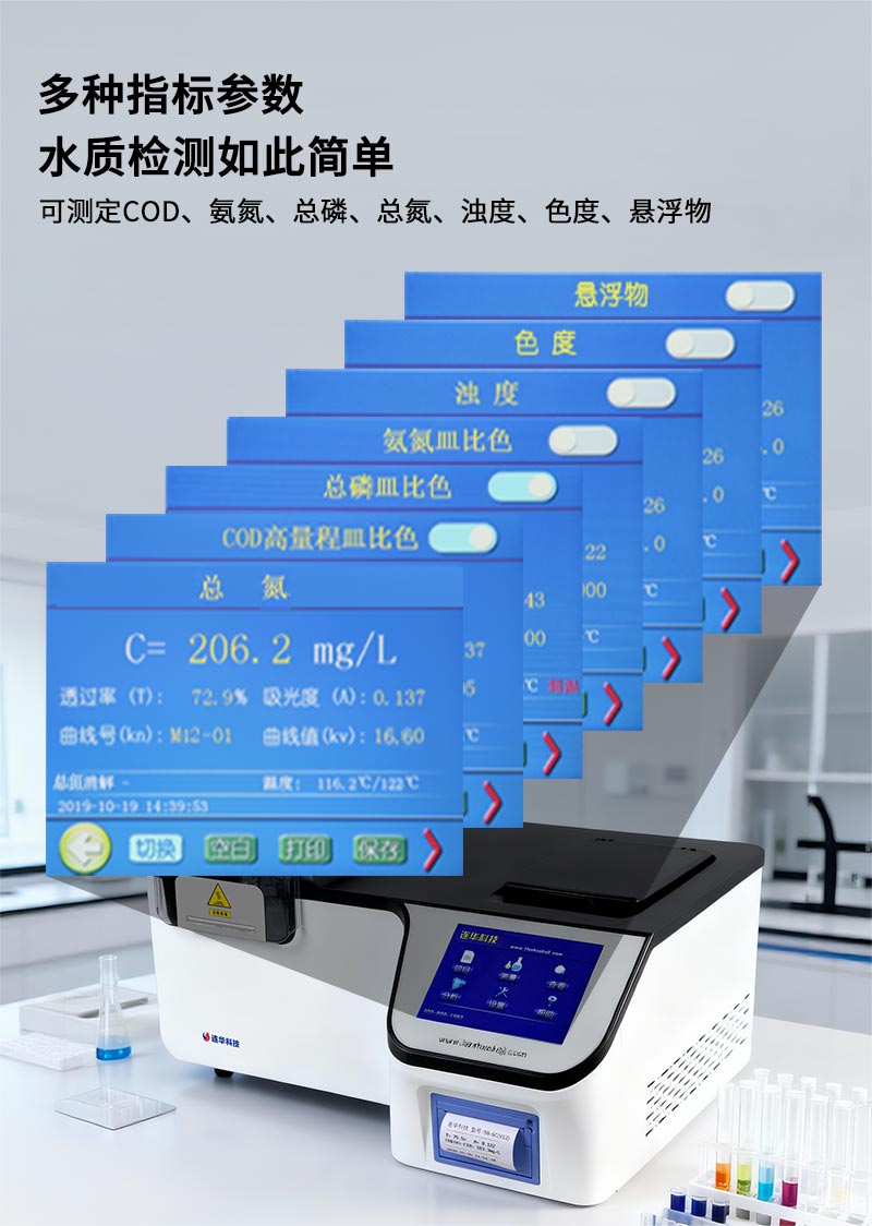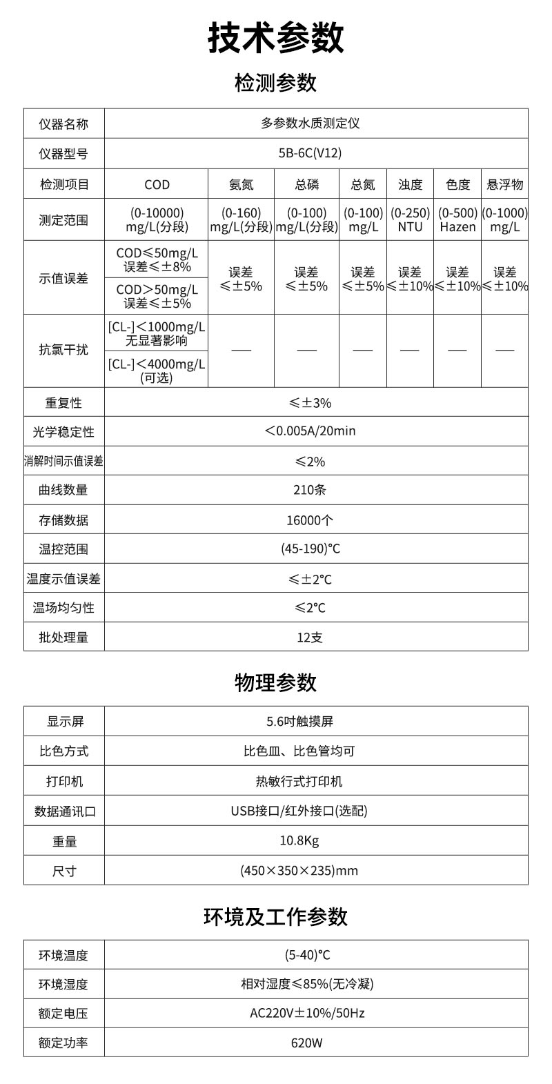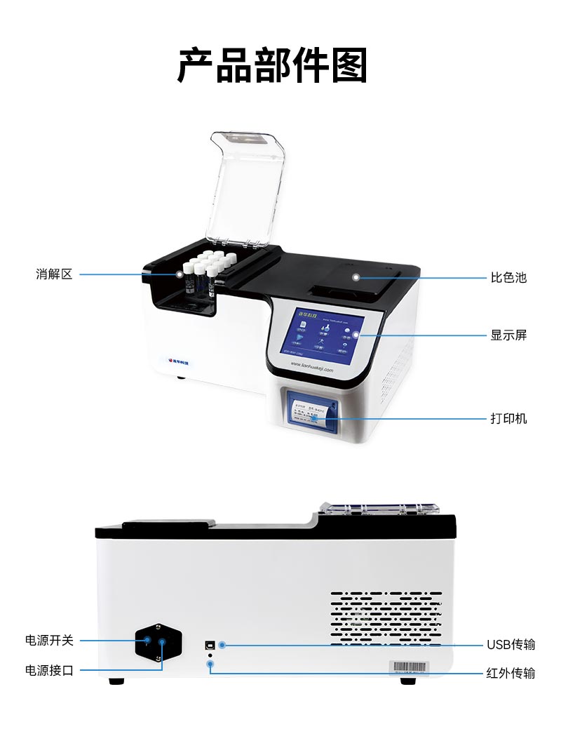 1.符合标准:设计上完全依据国家《快速消解分光光度法(HJ/T399-2007)》原理设计制造,符合JJG975-2002化学需氧量(COD)测定仪检定规程,适用于各种生活用水和工业废水的检测;2.多光路无干扰系统:具有多光路无干涉系统,可测定COD、氨氮、总磷、总氮、浊度、色度、悬浮物。支持皿比色和管比色两种比色方式;3.自带消解器:仪器自带消解器,具有智能升温、智能定时和延时保护等功能,可对水样进行消解;4.操作简单:采用直观的菜单导航系统以及5.6英寸的彩色触屏设计,符合日常操作习惯,更便于操作掌握;5.校准功能:仪器自备校准功能,可根据标准样品计算并存储曲线,无需手动制作曲线;6.测量准确:作为专业的水质测定仪,浓度直读,测量结果更准确稳定;7.数据传输:配备USB接口和红外传输功能,可向计算机传输存储的历史数据;8.数据存储打印:可存储1.6万组数据,并通过内置打印机打印当前数据和历史数据;