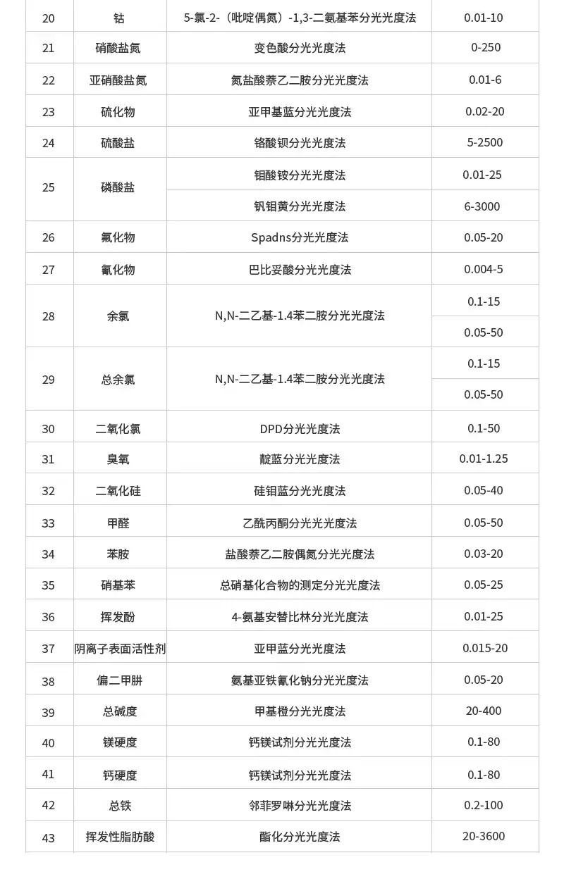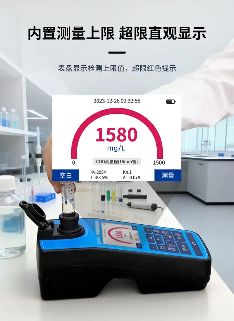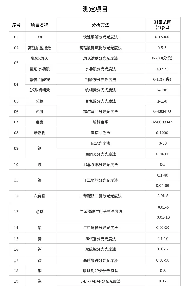 8、可测定COD、氨氮、总磷、总氮、悬浮物、色度、浊度、重金属、有机污染物和无机污染物等指标,浓度直读;