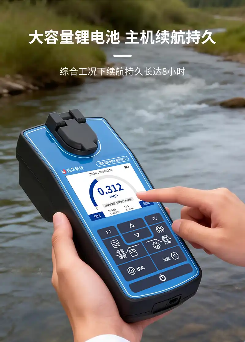1、手持式主机设计,重量仅0.6kg,可单手握持进行水质检测工作,户外使用极其方便;