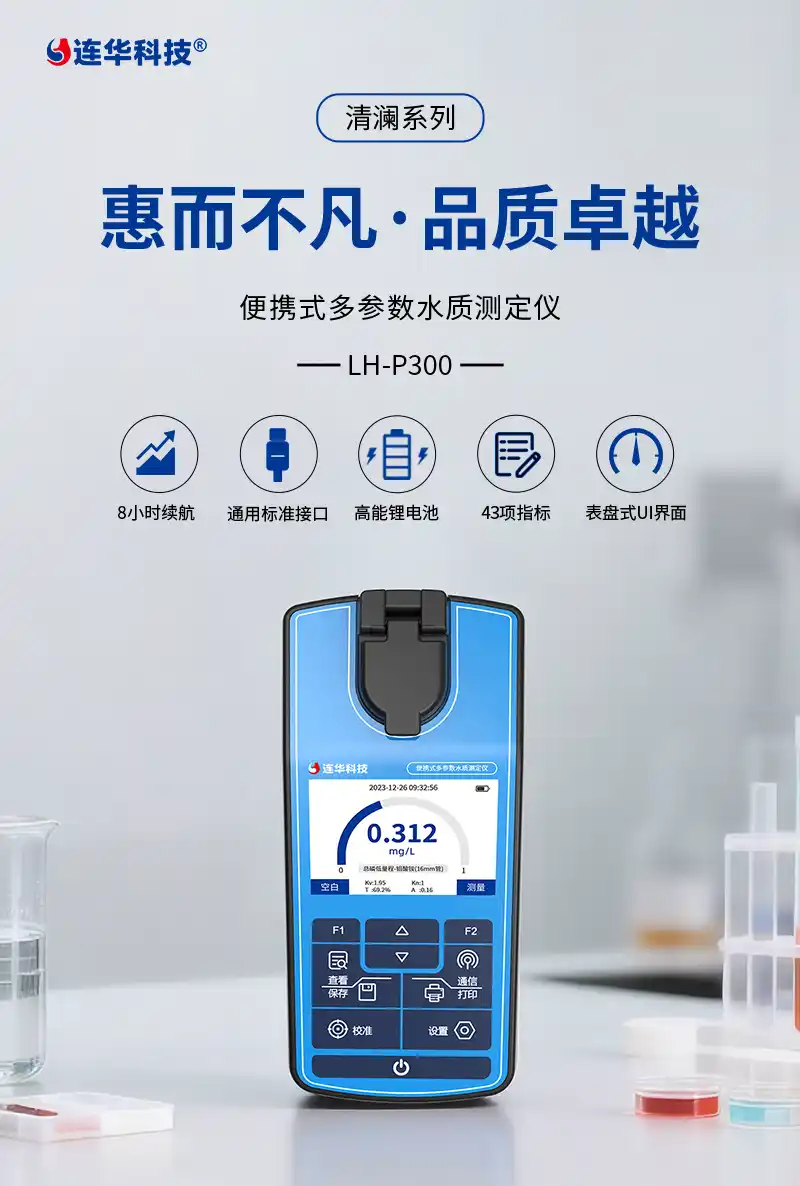简要描述: 清澜系列LH-P300是一款手持式多参数水质测定仪,能够快速、准确地测量水样中的COD、氨氮、总磷、总氮、有机污染物及无机污染物等多项参数,仪器小巧轻便,操作简单功能齐全,具有极高的性价比。经典连华家族式动态表盘界面,量程超限红色警示,内置大容量锂电池,采用Type-c标准接口,续航持久,充电、数据传输都非常方便。